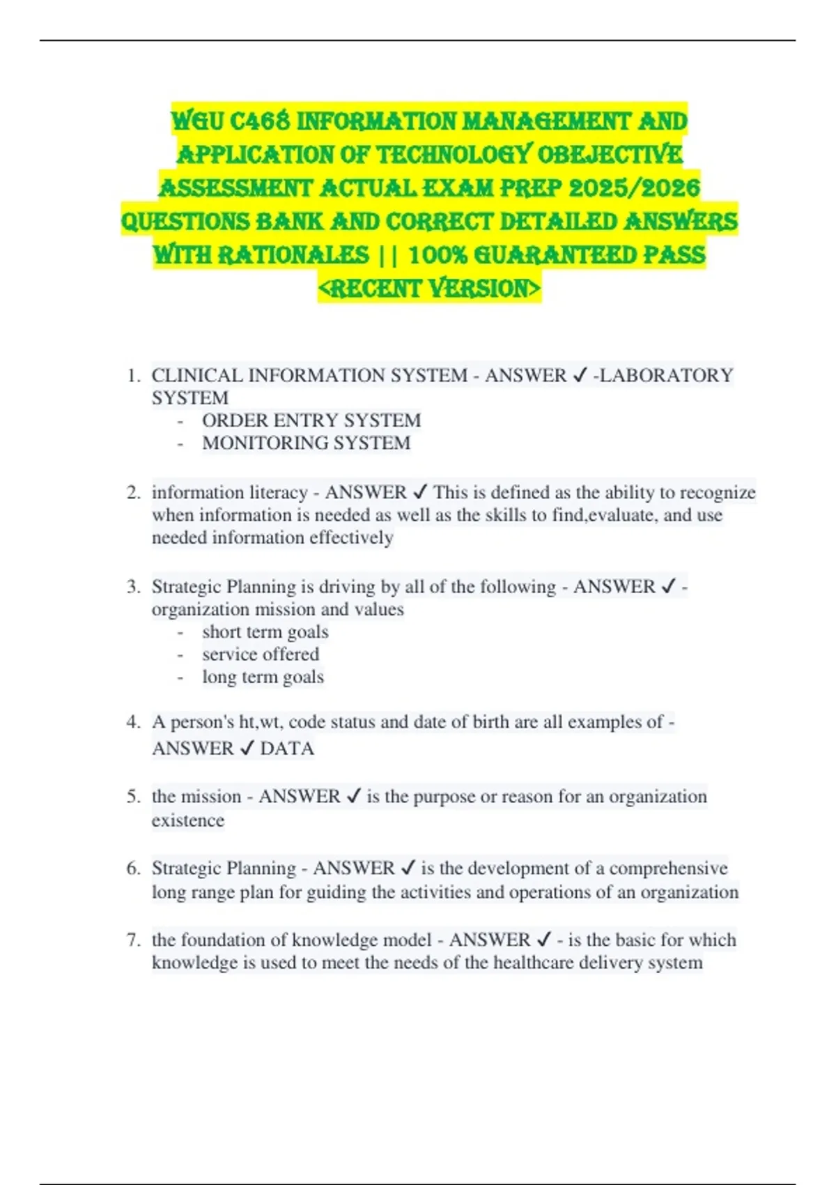 WGU C468 Information Management and Application of Technology OBEJECTIVE ASSESSMENT ACTUAL EXAM PREP 2025/2026 QUESTIONS BANK AND CORRECT DETAILED ANSWERS WITH RATIONALES || 100% GUARANTEED PASS RECENT VERSION 1. CLINICAL INFORMATION SYSTEM - ANSWER -LABORATORY SYSTEM - ORDER ENTRY SYSTEM - MONITORING SYSTEM 2. information literacy - ANSWER This is defined as the ability to recognize when information is needed as well as the skills to find,evaluate, and use needed information effectively 3. Strategic Planning is driving by all of the following - ANSWER - organization mission and values - short term goals - service offered - long term goals 4. A person's ht,wt, code status and date of birth are all examples of - ANSWER DATA 5. the mission - ANSWER is the purpose or reason for an organization existence 6. Strategic Planning - ANSWER is the development of a comprehensive long range plan for guiding the activities and operations of an organization 7. the foundation of knowledge model - ANSWER - is the basic for which knowledge is used to meet the needs of the healthcare delivery system - it is derived from its 3 key elements of knowledge acquisition, knowledge processing and knowledge dissemination 8. Nursing informatics - ANSWER the use of technology and information to help support all aspects of nursing practices 9. Information Life Cycle - ANSWER - needs assessment phase - system selection phase - system implementation phase - maintenance phase 10. emerging trends in healthcare - ANSWER - a push for patient safety - error reduction - additional regulatory requirements 11. Project Scope - ANSWER the size and details of a collaborative effort 12. NURSES ACTIVE PARTICIPATION IS IMPORTED TO ENSURE THE INFORMATION IS CURRENT AND ACCESSIBLE TO HC TEAM 13. DSS - ANSWER RELIES ON THE WISDOM OF THE USER TO TAKE ACTION 14. DSS - ANSWER CAN ENSURE THE 5 RIGHTS ARE IMPLEMENTED WHEN DEALING WITH MEDICATION ADMIN THEY CAN CHECK FOR DRUG TO DRUG INTERACTIONS AND ALLERGIES 15. TECHNOLOGY SOURCES THAT SUPPORTS PT SAFETY AND QUALITY IMPROVEMENT - ANSWER EHR CPOE ( COMPUTERIZED PHYSICIAN ORDER ENTRY) BARCODE MEDICATION E- PRESCRIPTION CLINICAL DECISION SUPPORT DASHBOARD REPORTS SMART TECHNOLOGY 16. EHR- - ANSWER CAPTURE DATA FOR QUALITY IMPROVEMENT RISK MANAGEMENT, RESOURCE PLANNING,PERFORMANCE MANAGEMENT AND SUPPORTS CLINICAL RESEARCH TRIALS AND EVIDENCE BASED RESEARCH 17. DRIVING FORCE FOR EHR - ANSWER -PT SAFETY -RESTRUCTURE HEALTHCARE DELIVERY SYSTEM TO IMPROVE THE QUALITY OF CARE -COST CONTAINMENT 18. BENEFITS OF THE EHR - ANSWER -INCREASE: DATA INTEGRITY AND QUALITY - PRODUCTIVITY - SATISFACTION FOR CAREGIVERS - DECEASES REDUNDANT DATA COLLECTION - PROMPTS TO ENSURE ADMINISTRATION OF TREATMENTS AND MEDICATIONS - ONGOING RECORD, ALLOWS DATA COMPARISON FROM PRIOR VISITS - SUPPORTS TRENDING 19. CPOE benefits - ANSWER - REDUCES MEDICATION ERROR - ELIMINATES TRANSCRIPTION ERROR - EXPEDITES TREATMENT - ENCOURAGES MORE ACCURATE, COMPLETE ORDERS 20. E-prescribing Benefits - ANSWER ALLOW DOCTORS TO ENTER RX AND THEN ELECTRONICALLY SEND TO PHARMACY FROM COMPUTES OR PDAs - provides longitudinal rx record - checks compliance and reimbursement - provides alerts about drug interactions - reminds to order home meds for the discharge client - eliminate phone authorization for refills 21. Dashboard Reporting - ANSWER -they are quality indicators EX: falls, infection rate, pressure ulcers - allows for data transparency - keep in mind reports only as good as the data recorded 22. Smart technology benefits - ANSWER EX: smart pump - improve quality, safety and efficiency in pt care - optimization of workflow by reducing and creating better workflow for clinicians - benefits clinicians and pts - keep in mind that adoption can take time and be slow and expensive when dealing with smart technology 23. Telehealth - ANSWER telehealth refers to a broader scope of remote healthcare services than telemedicine. 24. Telehealth can be remote clinical as well as non clinical services EX: provider training or/and administrative meetings 25. Telehealth allows healthcare practitioners and clients the benefit of long distance communication without the barriers 26. Driving force of telehealth - ANSWER - improved access to care quality of care continuity of care improved client record quality 27. Telehealth - ANSWER physician office benefits: -pt scheduling - ordering of test ( ex: labs, x rays) - RX order directly to pharmacy - internet patient education Home Health benefits: - realtime pt monitoring