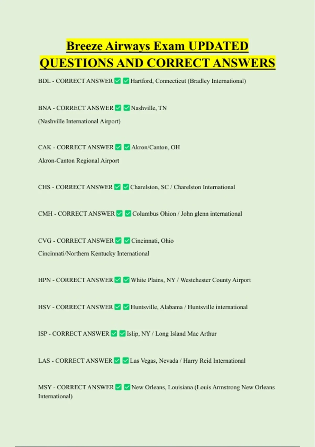 Breeze Airways Exam UPDATED QUESTIONS AND CORRECT ANSWERS BDL - CORRECT ANSWER BNA - CORRECT ANSWER (Nashville International Airport) CAK - CORRECT ANSWER Akron-Canton Regional Airport CHS - CORRECT ANSWER CMH - CORRECT ANSWER CVG - CORRECT ANSWER Hartford, Connecticut (Bradley International) Nashville, TN Akron/Canton, OH Charelston, SC / Charelston International Columbus Ohion / John glenn international