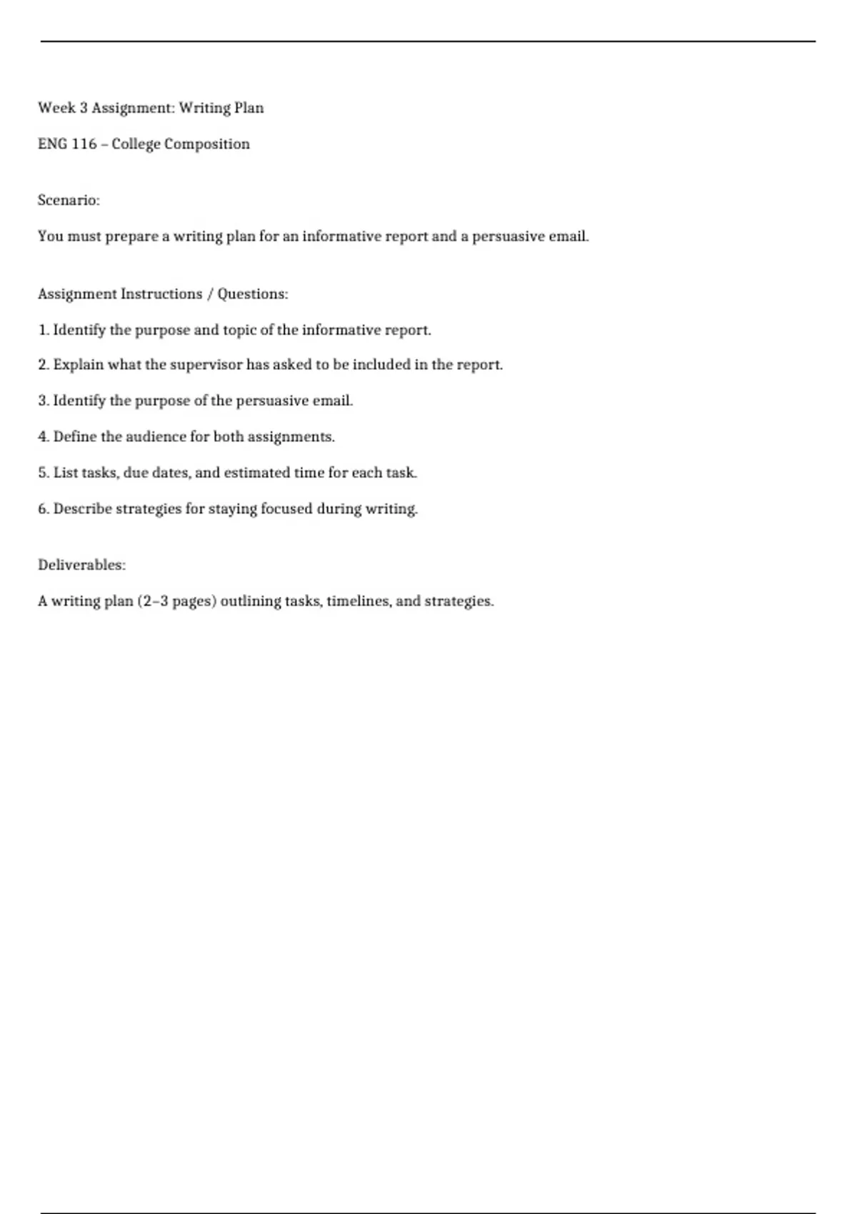 Week 3 Assignment: Writing Plan ENG 116 College Composition Scenario: You must prepare a writing plan for an informative report and a persuasive email. Assignment Instructions / Questions: 1. Identify the purpose and topic of the informative report. 2. Explain what the supervisor has asked to be included in the report. 3. Identify the purpose of the persuasive email. 4. Define the audience for both assignments. 5. List tasks, due dates, and estimated time for each task. 6. Describe strategies for staying focused during writing. Deliverables: A writing plan (23 pages) outlining tasks, timelines, and strategies. Week 3 Assignment: Writing Plan ENG116: Discover The Writer in You Professor Which topic do you want to write about in your informative one-pager and persuasive email? Physical Fitness Programs at Work What is the purpose of your one-pager? Inform What has th