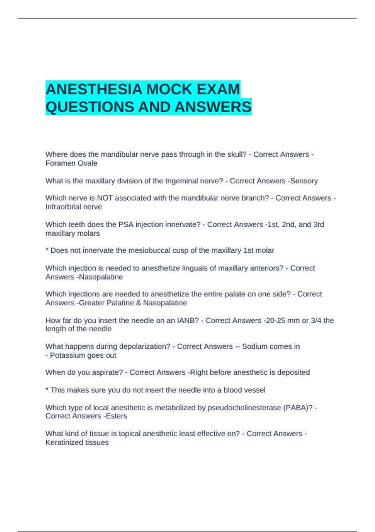 ANESTHESIA MOCK EXAM QUESTIONS AND ANSWERS