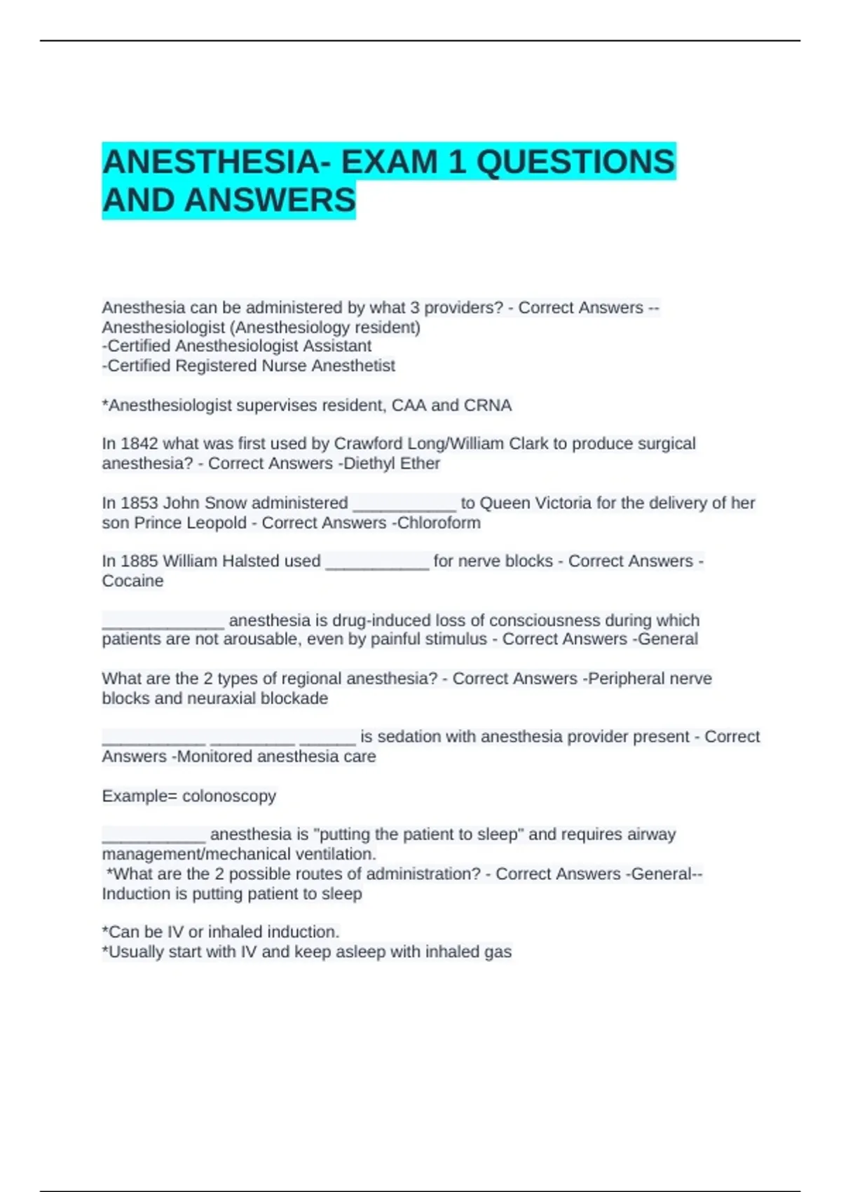 ANESTHESIA- EXAM 1 QUESTIONS