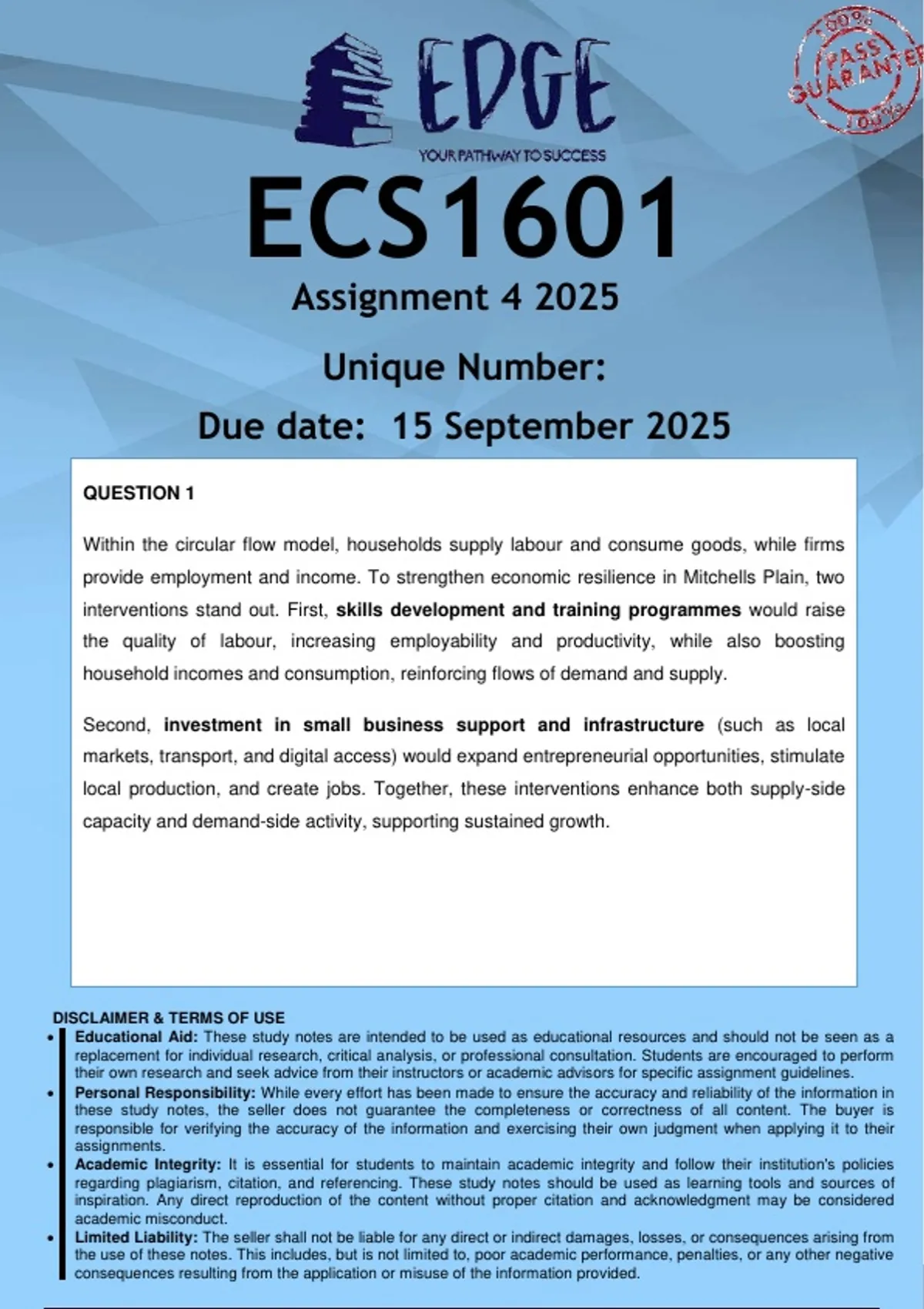 Well-structured ECS1601 Assignment 4 (ANSWERS) 2025 - DISTINCTION GUARANTEED. (DETAILED ANSWERS - DISTINCTION GUARANTEED!)..... Question 1 [7 Marks] (Word Count = 100) With reference to the Circular flow model as well as economic growth, detail and discuss two interventions that would most effectively support economic resilience in Mitchells Plain? Question 2 [18 Marks] (Word Count = 450) Study the image showing Dr. David |. Ramadan’s X post and the background to answer the questions 2.1 to 2.3. “> Dr. David I. Ramadan xX y @DavidiRamadan - Follow Congratulations to all #Trump voters—thanks to your dear leader's #tariff tantrum, nearly everything we buy will cost about 20% more in the coming year. And no, “just buy American” isn't a fix—most of these items have no U.S. equivalent. That's just the short-term hit. 3 : ~ 3:08 AM - Apr 3, 2025 @ Page 3 of 5 ECS1601 | Assessment 04 | Year 2025 A university of south africa UNISA Background In April 2025, US President Donald J Trump, implemented reciprocal tariffs for countries that traded with the USA. This is to address the United States’ $1.3 Trillion (~R 22.84 trillion) Trade Deficit'. Amongst the countries that were levied the highest tariff include South Africa’s neighbouring country, the Kingdom of Lesotho, with a tariff of approximately 50%. In addition, the Republic of South Africa was also levied a tariff of approximately 30% within the same time period and came into effect in August 2025. You are an economics 1 student from UNISA and overhear some of your peers at the Spaza shop discussing the matter and stating that it might not be a bad thing, “Donald Trump is doing well to help his country”. Question 2.1. [8 Marks] As an economic student explain to them why this is not a good thing from the perspective of Economic Growth for Republic of South Africa and/or Kingdom of Lesotho, using the AD-AS model. In your response, clearly explain the effects on aggregate demand and/or aggregate supply, and illustrate how this translates to changes in real GDP and price levels. Question 2.2. [7 Marks] As an economics student explain to them why this is a good thing for the United States of America, from the perspective of the foreign exchange market and the Net-Exports. Demonstrate your point with the use of the Keynesian Model graph. Question 2.3. [3 Marks] In understanding the Monetary Transmission Mechanism, detail the impact of the repo rate decrease on the multiplier given the above US interventions Question 3 [10 Marks] (Word Count = 200) Question 3.1. and 3.2. are based on the following passage sourced from Statistics South Africa [2025]: 1 Wall Street Journal [2025]., The Countries Driving America’s $1.2 Trillion Trade Deficit in Goods. Washington. Url: August 2025 Page 4o0f 5 ECS1601 | Assessment 04 | Year 2025 university of south africa UNISA fxn Capitec CEO Mr Fourie had suggested that the actual unemployment rate, which Stats SA reports at 32.9%, may be closert o 10%, based on observations of informal economic activity Source: Statistics South Africa (2025)., Stats SA Engages Capitec on Labour Statistics and Informal Sector Dynamics., Pretoria. , Retrieved from: https: /Asa. servations%200f%20informal%20economic%20activity. Accessed: 08 August 2025 Question 3.1. [3 Marks] Define what Economists mean by the official unemployment rate presented in the source above. Question 3.2. [7 Marks] From your definition above, recall the reason as to why the CEO of Capitec is incorrect in his statement that the unemployment rate is 10%. Question 4 [15 Marks] (Word Count = 200) Study the following extract to answer questions 4.1. and 4.2. For the second year in a row, Treasury has left personal income tax brackets and rebates unchanged -— effectively handing South Africans a stealth tax in this year’s Budget. it will be felt in the take-home pay of salaried workers, particularly those in the lower- to middle-income bracket, warns Carla Rossouw. The decision to leave personal income tax brackets and rebates the same in the 2025/2026 tax year is a blow to taxpayers, squeezing lower- to middle-income earners further. Source: Rossouw., C., (2025) Earning more, taking home less: The hidden tax hike in this year’s Budget. Johannesburg. Retrieved from: https:/A personal-investing/earning-more-taking-home-less-the-hidden-tax-hike-in-this-yearsbudget/ Accessed: 08 August 2025 Question 4.1. [10 Marks] Using the Keynesian Model for South Africa (as a close economy with a public sector) discuss and denote the implications of the above statements. Your discussion should include a diagram and/or Algebraic expression. Question 4.2. [5 Marks] Given the ramifications detailed in the extract above, evaluate the impact of the above (4.1 answer) from the perspective of the Phillips Curve relation and how it will affect South Africa’s income inequality problem.