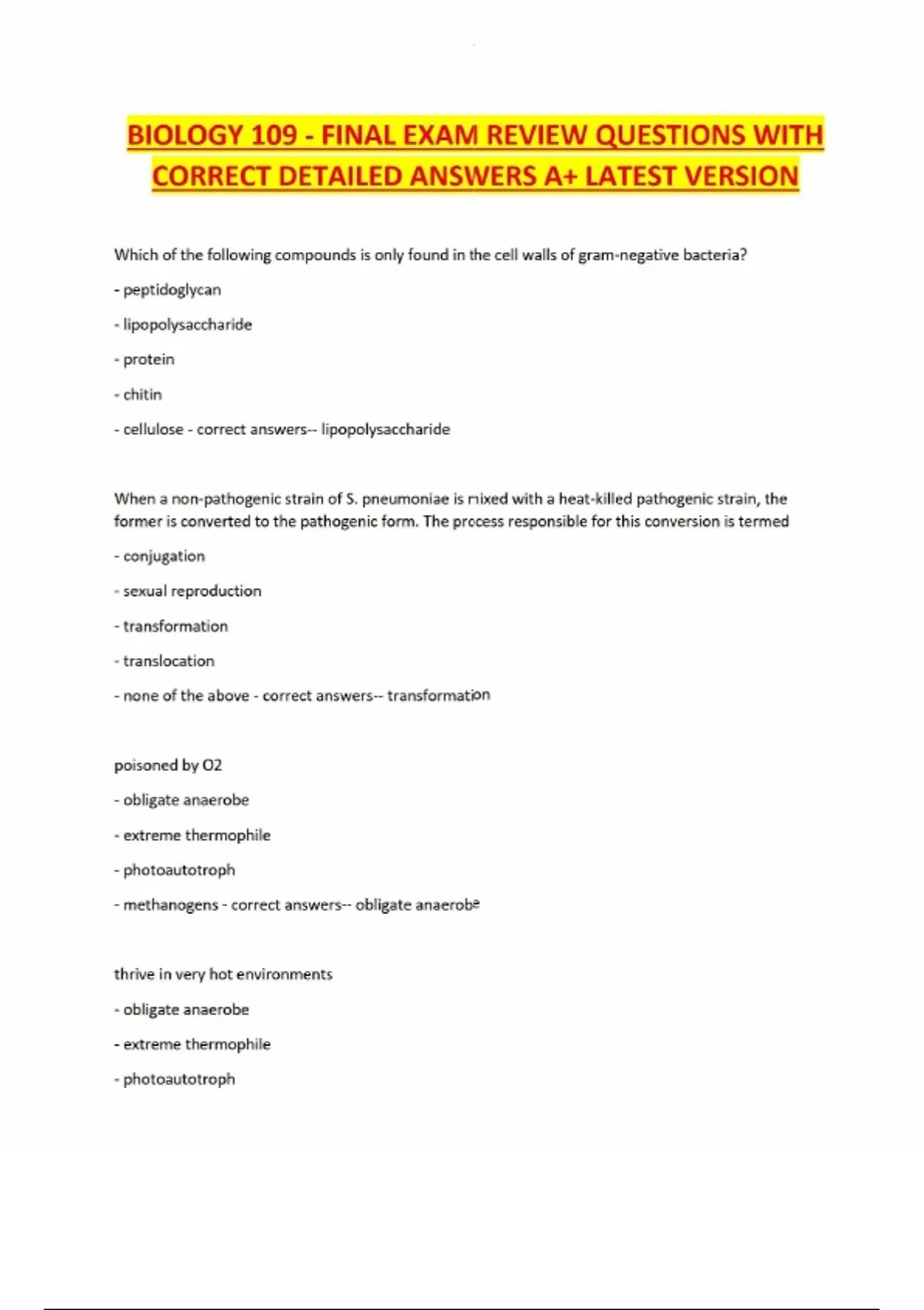 BIOLOGY 109 - FINAL EXAM REVIEW QUESTIONS WITH CORRECT DETAILED ANSWERS A+ LATEST VERSION Which of the following compounds is only found in the cell walls of gram-negative bacteria? - peptidoglycan - lipopolysaccharide - protein - chitin - cellulose - correct answers-- lipopolysaccharide When a non-pathogenic strain of S. pneumoniae is mixed with a heat-killed pathogenic strain, the former is converted to the pathogenic form. The process responsible for this conversion is termed - conjugation - sexual reproduction - transformation - translocation - none of the above - correct answers-- transformation poisoned by O2 - obligate anaerobe - extreme thermophile - photoautotroph - methanogens - correct answers-- obligate anaerobe