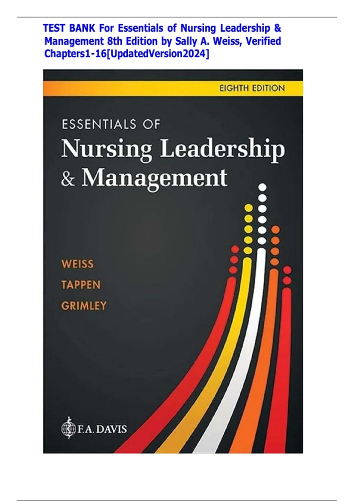 Get full access to the Test Bank for Essentials of Nursing Leadership & Management, 7th Edition by Sally A. Weiss. Includes all chapters with multiple-choice questions, answers, and rationales. Perfect for nursing students and instructors for exam preparation, review, and teaching resources.