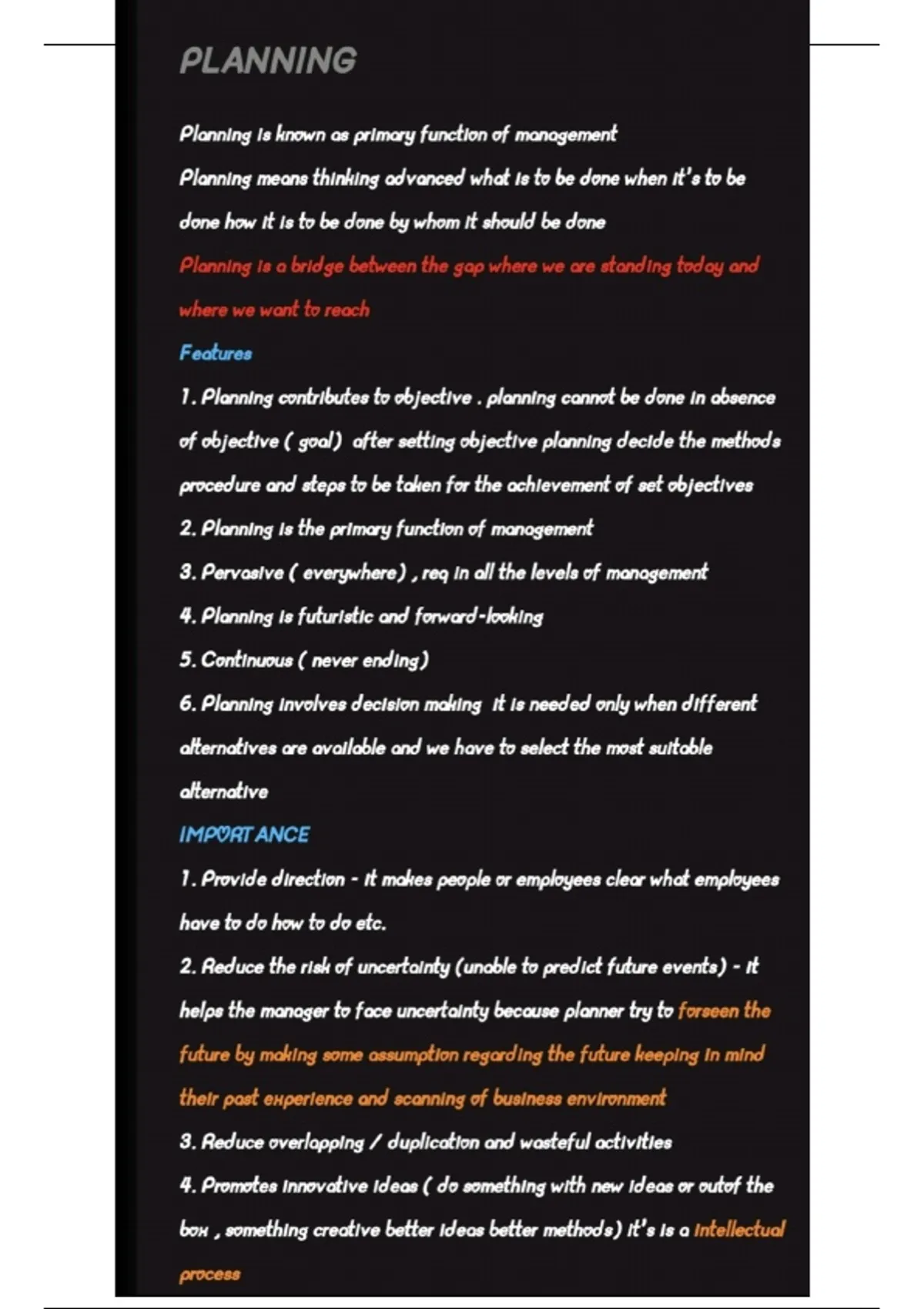 This document outlines planning as a primary management function that involves deciding future actions in advance. It details its features, importance, limitations, a step-by-step process, and the different types of plans, such as single-use and standing plans
