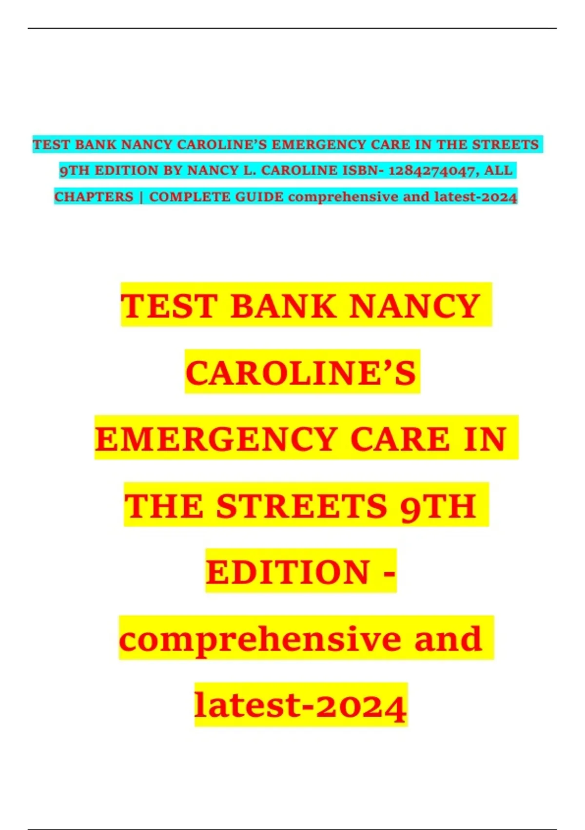 Nancy Caroline’s Emergency Care in the Streets 9th Edition | Complete Verified Chapters 1–53 (Newest 2025 VeAccess the Nancy Caroline’s Emergency Care in the Streets 9th Edition Test Bank with verified chapters 1–53. The newest 2025 version includes complete exam questions and answers to support EMT, paramedic, and emergency care )