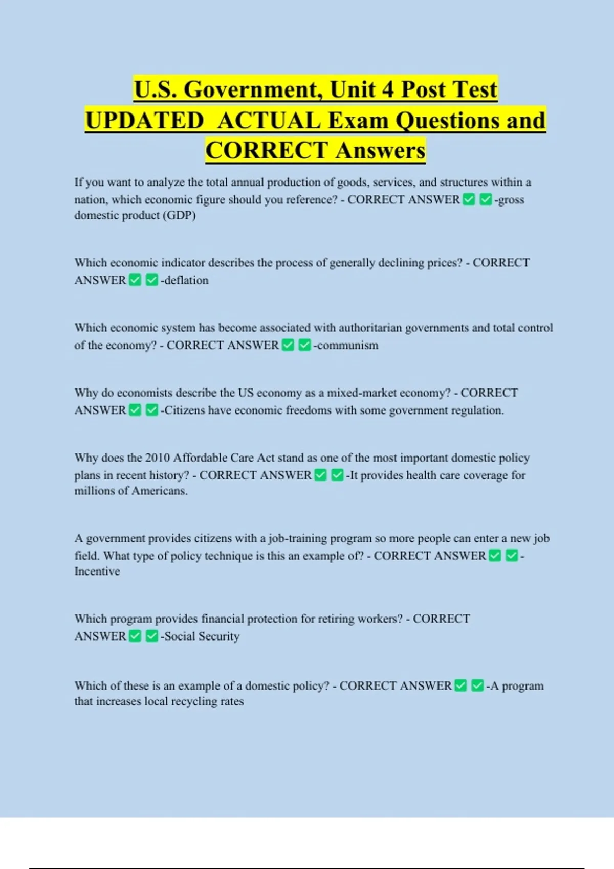 U.S. Government, Unit 4 Post Test UPDATED ACTUAL Exam Questions and CORRECT Answers