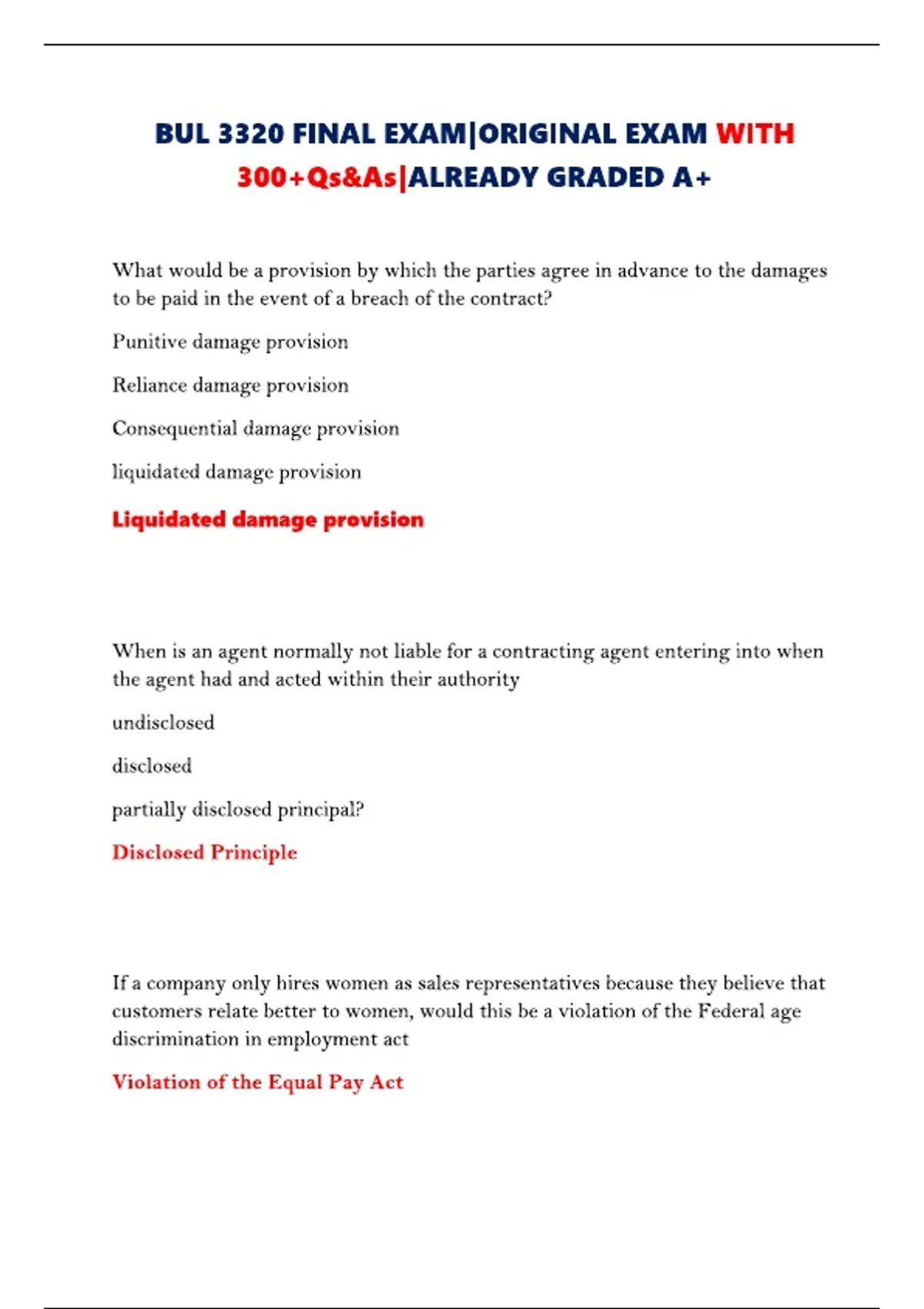 BUL 3320 FINAL EXAM|ORIGINAL EXAM WITH 300+Qs&As|ALREADY GRADED A+