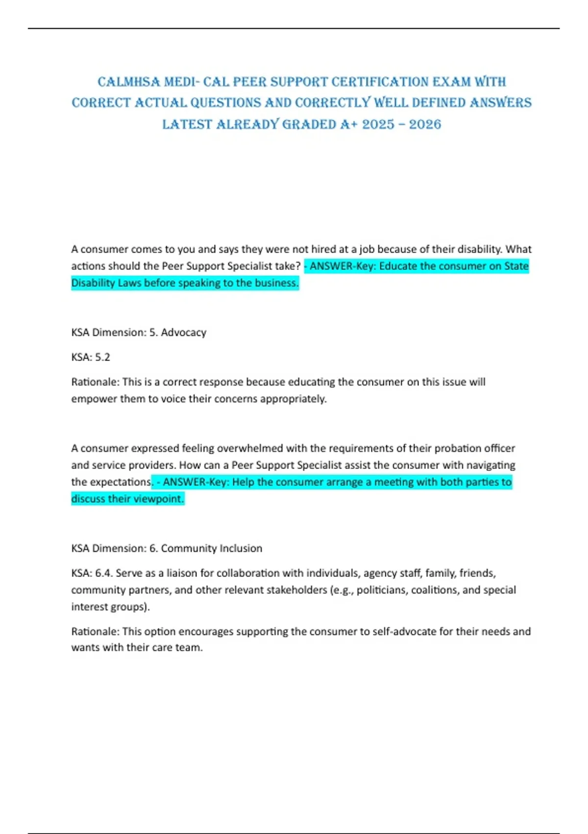 CALMHSA MEDI- CAL PEER SUPPORT CERTIFICATION EXAM WITH CORRECT ACTUAL QUESTIONS AND CORRECTLY WELL DEFINED ANSWERS LATEST ALREADY GRADED A+ 2025 – 2026