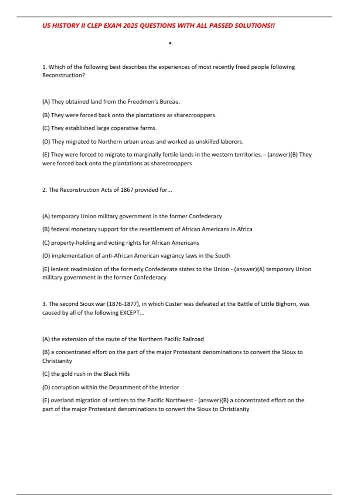 , US HISTORY II CLEP EXAM 2025 QUESTIONS WITH ALL PASSED SOLUTIONS!!
