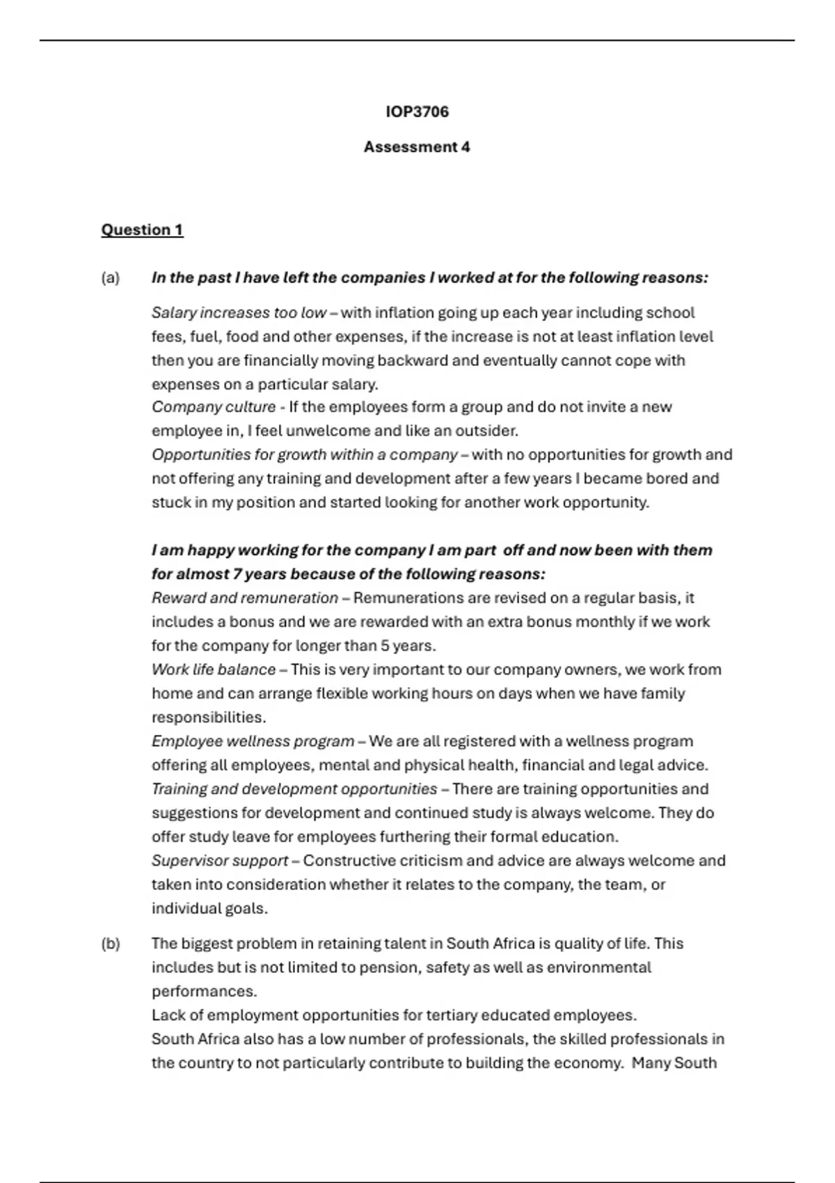 (b) The biggest problem in retaining talent in South Africa is quality of life. This