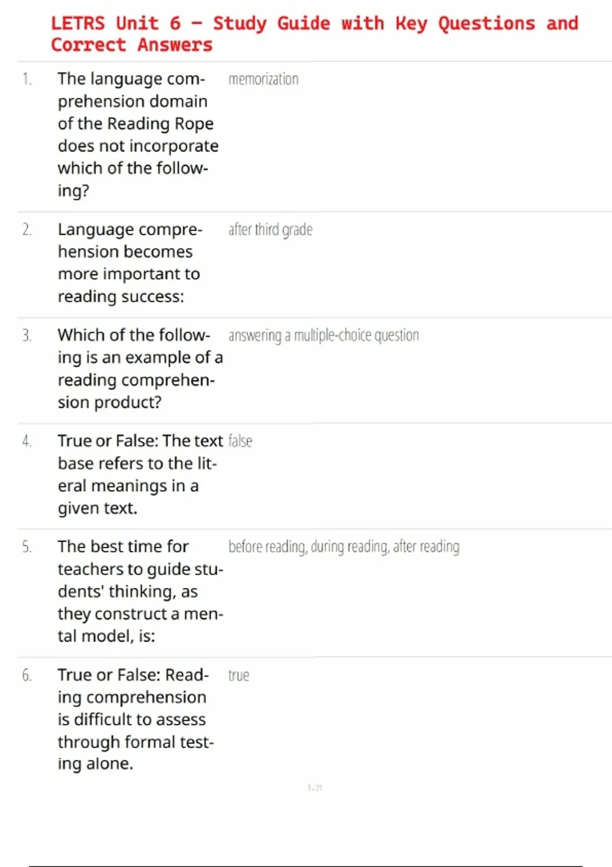 Master LETRS Unit 6 concepts with this focused study guide. Includes key questions and correct answers to help you understand essential literacy and reading instruction principles, strengthen knowledge, and prepare effectively for assessments.