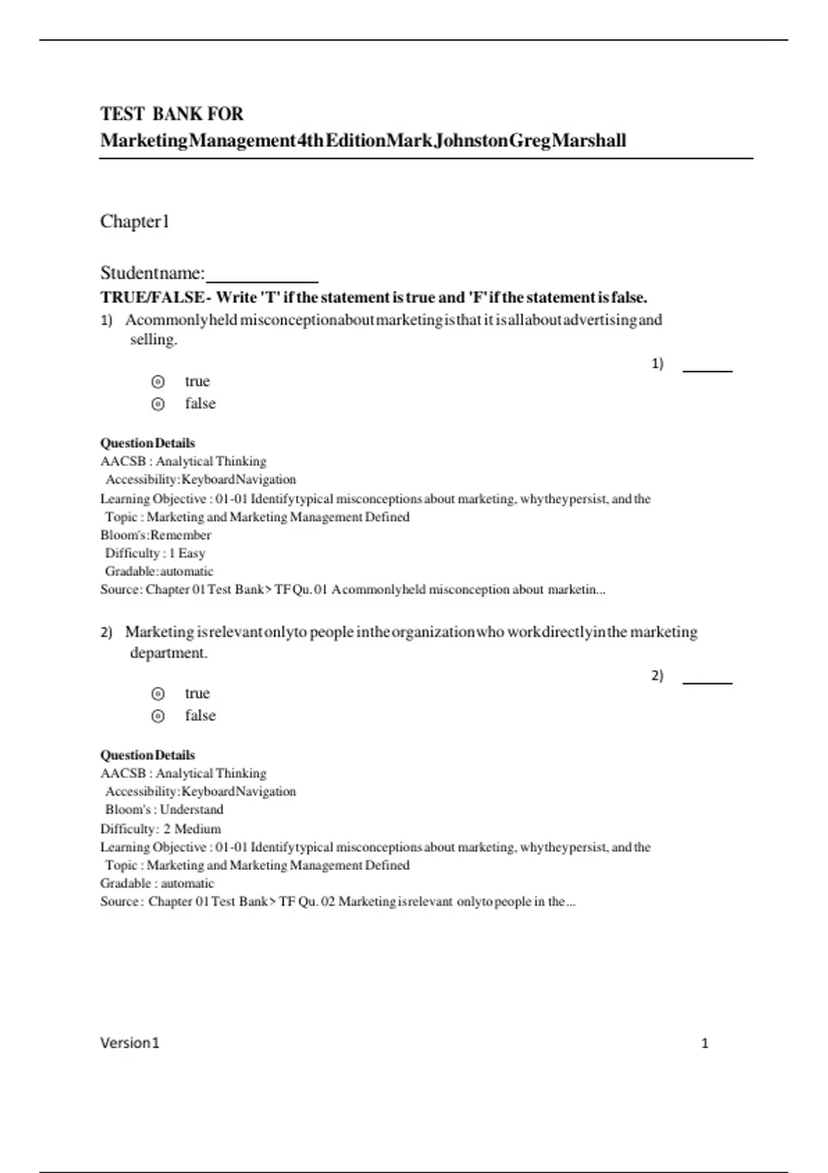 Source : Chapter 01 Test Bank > TF Qu. 01 A commonlyheld misconception about marketin...