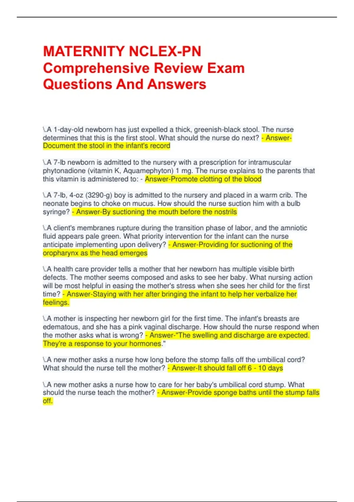 MATERNITY NCLEX-PN Comprehensive Review Exam Questions And Answers .A 1-day-old newborn has just expelled a thick, greenish-black stool. The nurse determines that this is the first stool. What should the nurse do next? - Answer-Document the stool in the infant's record .A 7-lb newborn is admitted to the nursery with a prescription for intramuscular phytonadione (vitamin K, Aquamephyton) 1 mg. The nurse explains to the parents that this vitamin is administered to: - Answer-Promote clotting of the blood .A 7-lb, 4-oz (3290-g) boy is admitted to the nursery and placed in a warm crib. The neonate begins to choke on mucus. How should the nurse suction him with a bulb syringe? - Answer-By suctioning the mouth before the nostrils .A client's membranes rupture during the transition phase of labor, and the amniotic fluid appears pale green. What priority intervention for the infant can the nurse anticipate implementing upon delivery? - Answer-Providing for suctioning of the oropharynx as the head emerges .A health care provider tells a mother that her newborn has multiple visible birth defects. The mother seems composed and asks to see her baby. What nursing action will be most helpful in easing the mother's stress when she sees her child for the first time? - Answer-Staying with her after bringing the infant to help her verbalize her feelings. .A mother is inspecting her newborn girl for the first time. The infant's breasts are edematous, and she has a pink vaginal discharge. How should the nurse respond when the mother asks what is wrong? - Answer-"The swelling and discharge are expected. They're a response to your hormones." .A new mother asks a nurse how long before the stomp falls off the umbilical cord? What should the nurse tell the mother? - Answer-It should fall off 6 - 10 days .A new mother asks a nurse how to care for her baby's umbilical cord stump. What should the nurse teach the mother? - Answer-Provide sponge baths until the stump falls off.