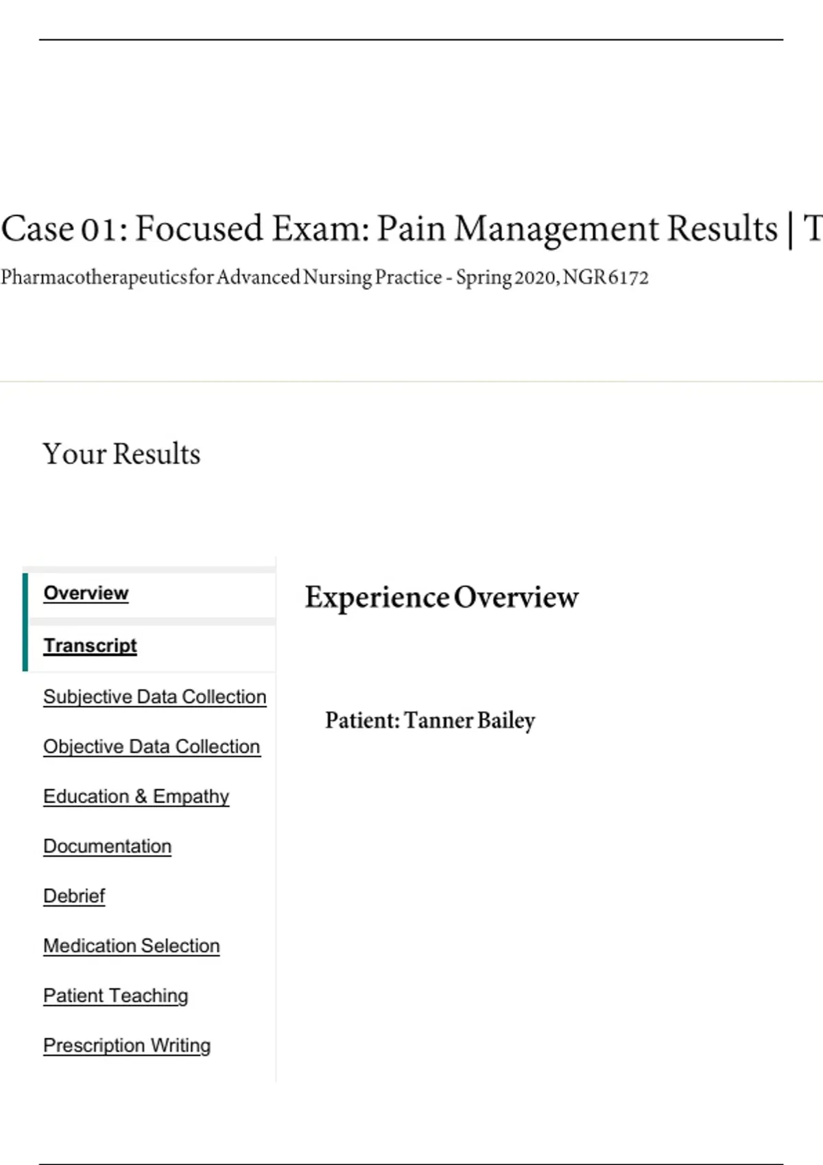 Tanner Bailey – Pain Management Focused Exam (Shadow Health) – Transcript and Clinical Notes