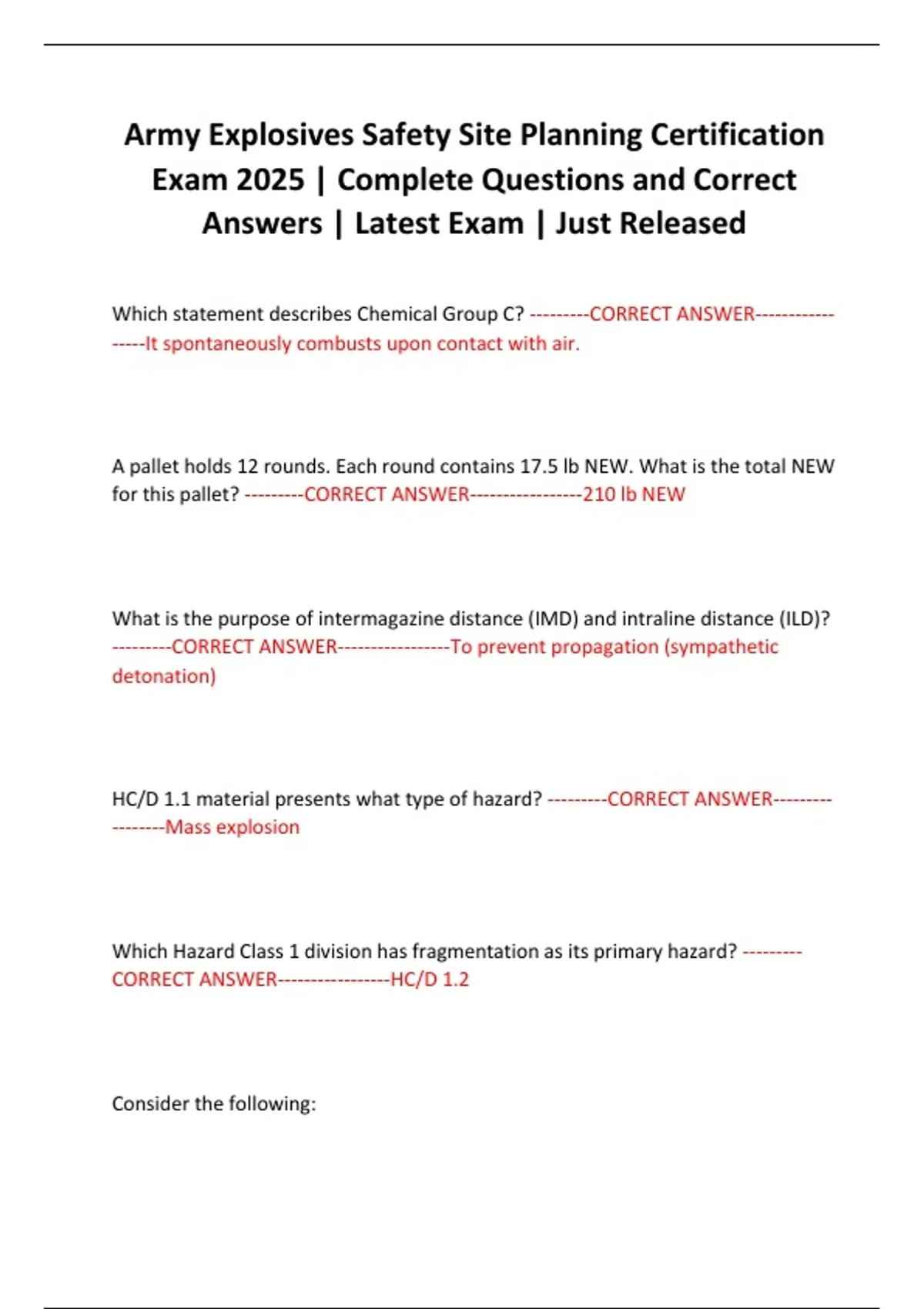 Army Explosives Safety Site Planning Certification Exam 2025 | Complete Questions and Correct Answers | Latest Exam | Just Released