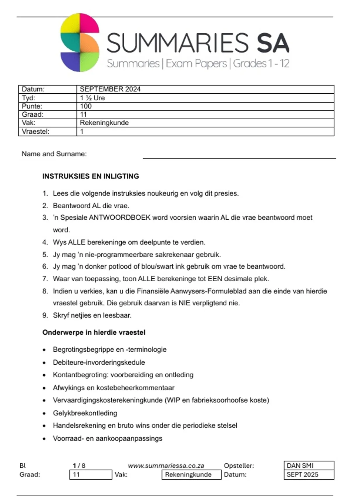 Graad 11 Rekeningkunde Kwartaal 3 (September ) 2025 Vraestel en Memo Totaal:  100 punte. Inhoud: Begrotingsbegrippe en -terminologie Debiteure-invorderingskedule Kontantbegroting: voorbereiding en ontleding Afwykings en kostebeheerkommentaar Vervaardigingskosterekeningkunde (WIP en fabrieksoorhoofse koste) Gelykbreekontleding Handelsrekening en bruto wins onder die periodieke stelsel Hierdie is 'n oefenvraestel met memorandum bedoel om die leerling se kennis te toets, en sal nie dieselfde vraestel wees wat vir die eksamen geskryf word nie. DAN SMI