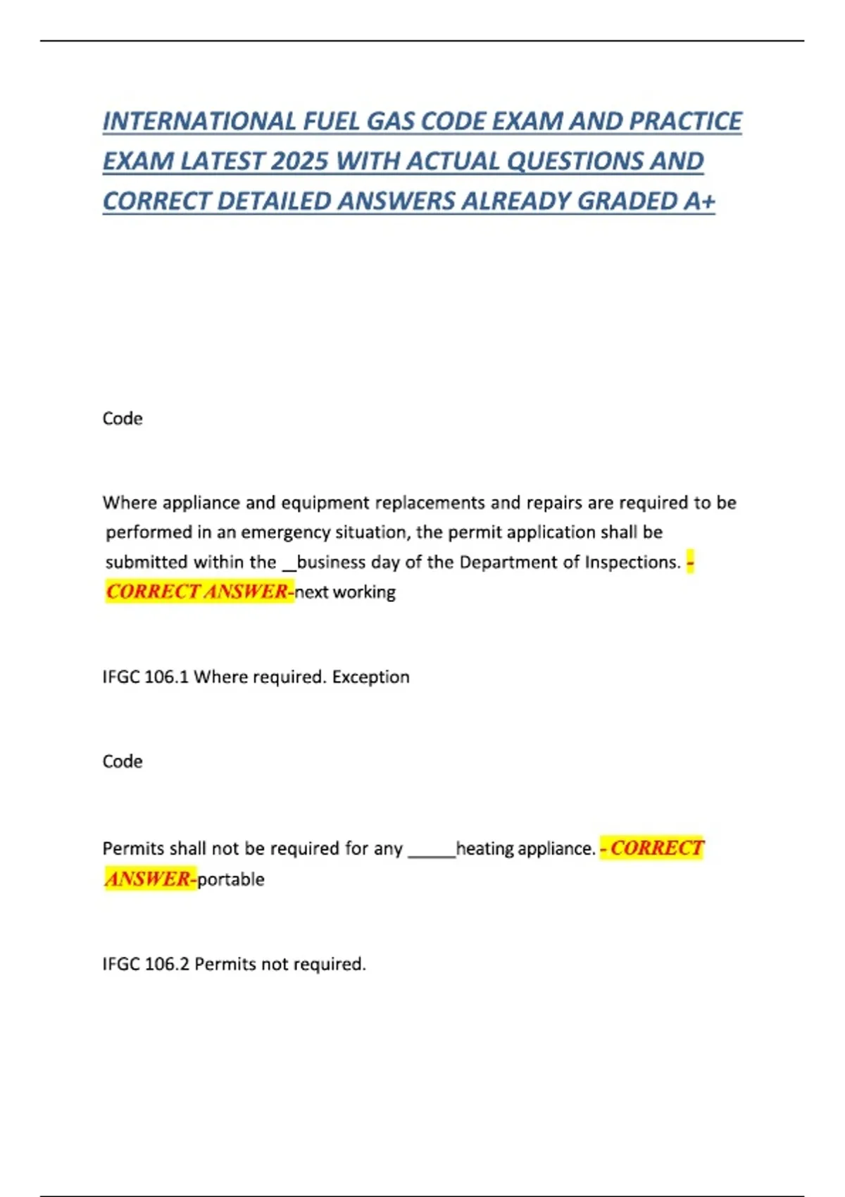 This is a comprehensive and verified study guide for the International Fuel Gas Code (IFGC) exam. It provides actual questions and correct, detailed answers to help users prepare for and pass the test. The document covers a wide range of topics, including permit requirements for appliance replacements, permit expiration and extension periods, and the retention of construction documents. It also includes key definitions from the IFGC, such as those for "Appliance," "Excess Flow Valve," "Gas Piping," and "Combustion Air". This guide is a valuable resource for understanding the code and preparing for the exam