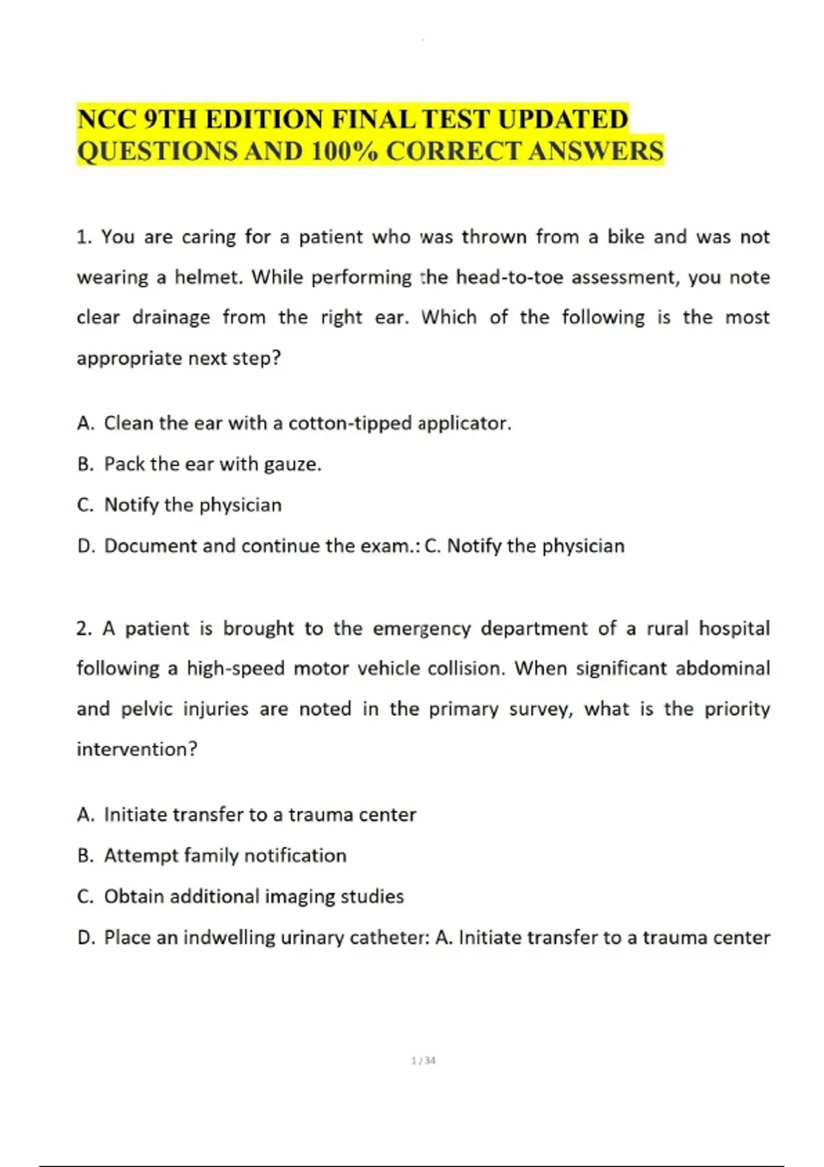 NCC 9TH EDITION FINAL TEST UPDATED QUESTIONS AND 100% CORRECT ANSWERS 1. You are caring for a patient who was thrown from a bike and was not wearing a helmet. While performing the head-to-toe assessment, you note clear drainage from the right ear. Which of the following is the most appropriate next step? A. Clean the ear with a cotton-tipped applicator. B. Pack the ear with gauze. C. Notify the physician D. Document and continue the exam.: C. Notify the physician 2. A patient is brought to the emergency department of a rural hospital following a high-speed motor vehicle collision. When significant abdominal and pelvic injuries are noted in the primary survey, what is the priority intervention? A. Initiate transfer to a trauma center B. Attempt family notification C. Obtain additional imaging studies D. Place an indwelling urinary catheter: A. Initiate transfer to a trauma center 3. An adult who fell from a second story roof is brought to t