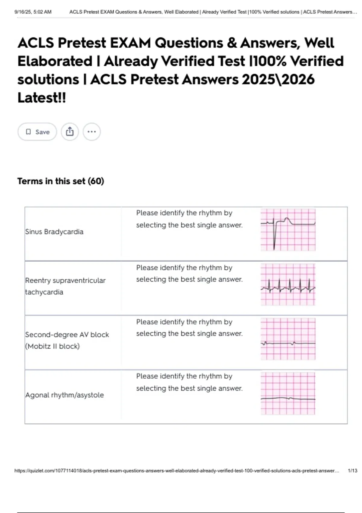 , 9/16/25, 5:02 AM ACLS Pretest EXAM Questions & Answers, Well Elaborated | Already Verified Test |100% Verified solutions | ACLS Pretest Answers…