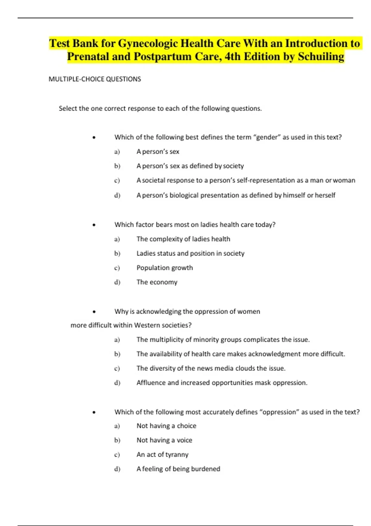 Select the one correct response to each of the following questions.