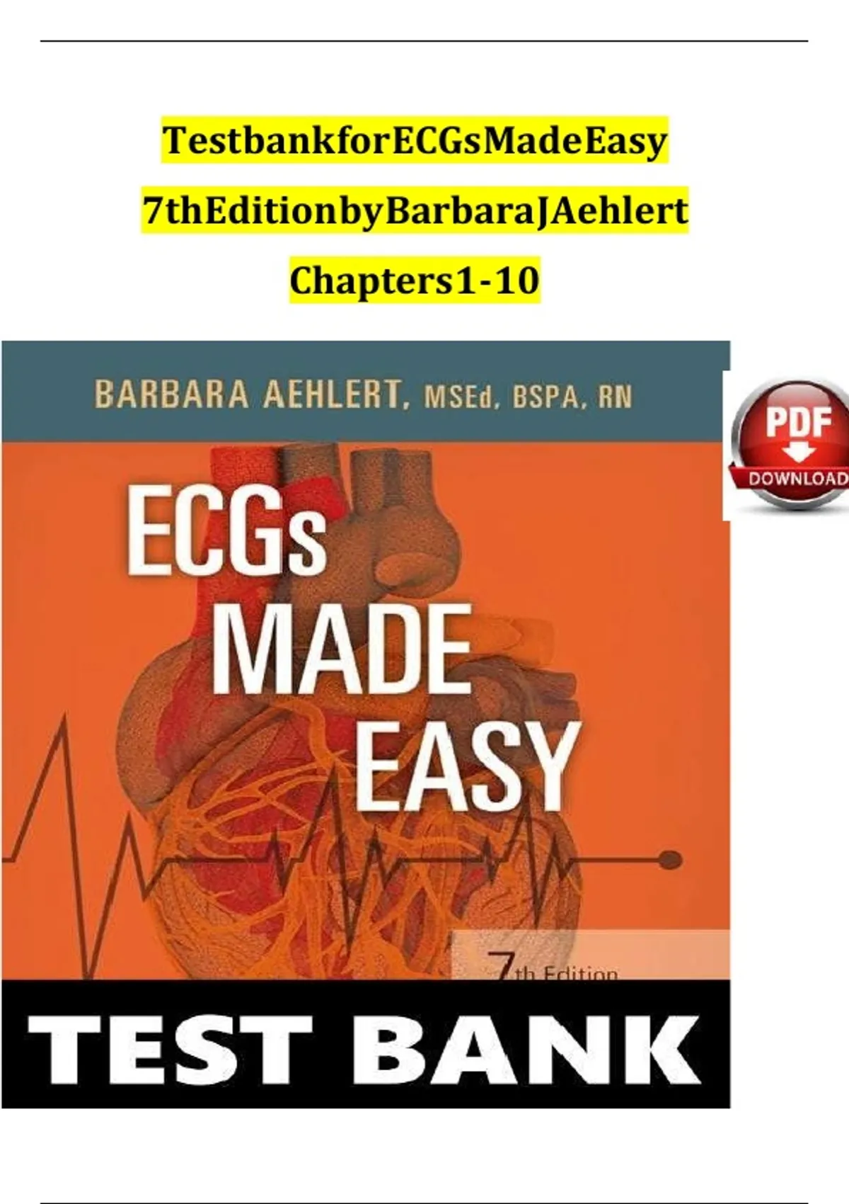 ECGs Made Easy 6th Edition by Barbara Aehlert Test Bank Table of Contents: Chapter 1. Anatomy & Physiology Chapter 2. Basic Electrophysiology Chapter 3. Sinus Mechanisms Chapter 4. Atrial Rhythms Chapter 5. Junctional Rhythms Chapter 6. Ventricular Rhythms Chapter 7. Atrioventricular Blocks Chapter 8. Pacemaker Rhythms Chapter 9. Introduction to the 12-Lead ECG Chapter 10. Post-Test