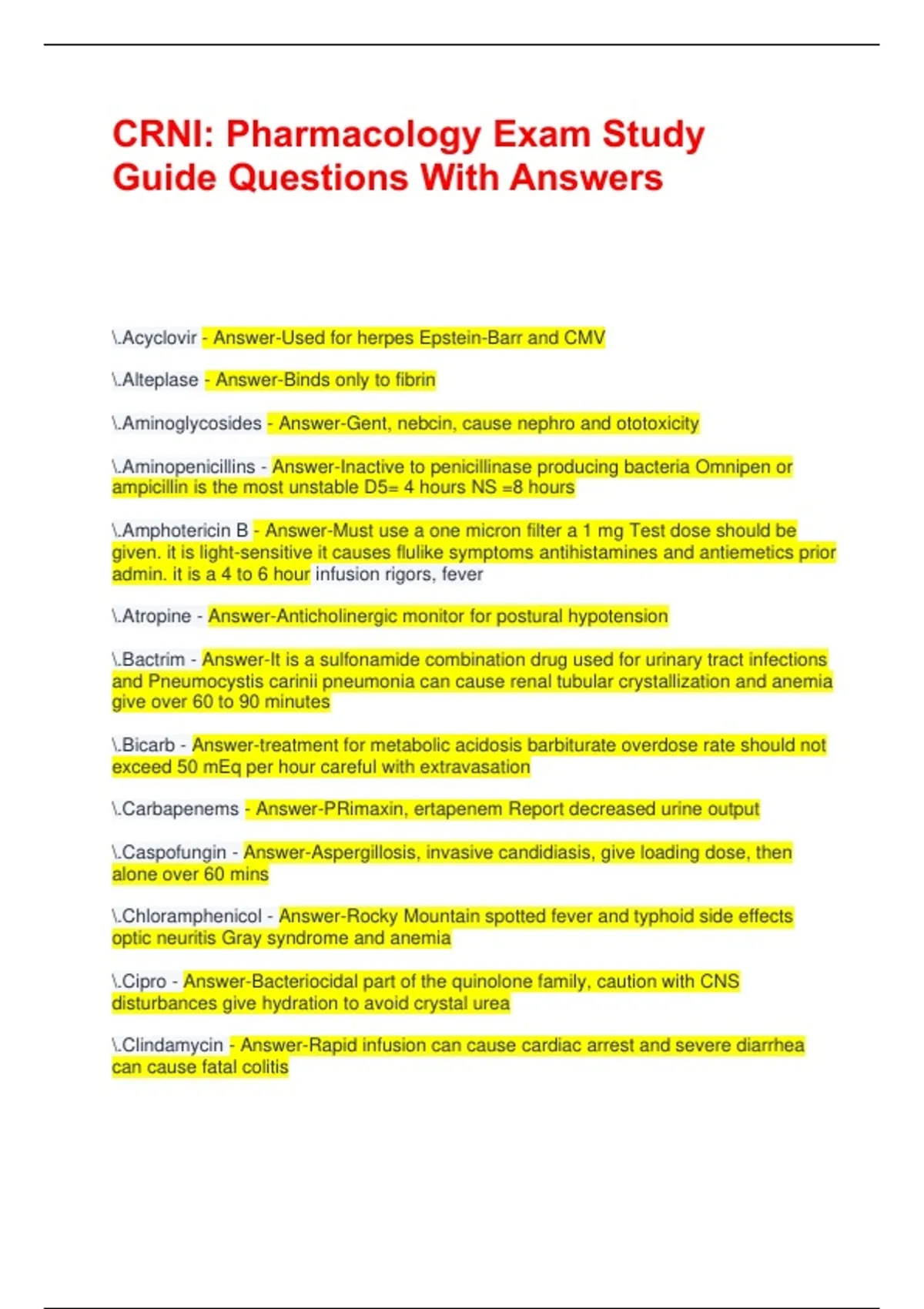 CRNI: Pharmacology Exam Study Guide Questions With Answers .Acyclovir - Answer-Used for herpes Epstein-Barr and CMV .Alteplase - Answer-Binds only to fibrin .Aminoglycosides - Answer-Gent, nebcin, cause nephro and ototoxicity .Aminopenicillins - Answer-Inactive to penicillinase producing bacteria Omnipen or ampicillin is the most unstable D5= 4 hours NS =8 hours .Amphotericin B - Answer-Must use a one micron filter a 1 mg Test dose should be given. it is light-sensitive it causes flulike symptoms antihistamines and antiemetics prior admin. it is a 4 to 6 hour infusion rigors, fever .Atropine - Answer-Anticholinergic monitor for postural hypotension .Bactrim - Answer-It is a sulfonamide combination drug used for urinary tract infections and Pneumocystis carinii pneumonia can cause renal tubular crystallization and anemia give over 60 to 90 minutes .Bicarb - Answer-treatment for metabolic acidosis barbiturate overdose rate should not exceed 50 mEq per hour careful with extravasation .Carbapenems - Answer-PRimaxin, ertapenem Report decreased urine output .Caspofungin - Answer-Aspergillosis, invasive candidiasis, give loading dose, then alone over 60 mins .Chloramphenicol - Answer-Rocky Mountain spotted fever and typhoid side effects optic neuritis Gray syndrome and anemia .Cipro - Answer-Bacteriocidal part of the quinolone family, caution with CNS disturbances give hydration to avoid crystal urea .Clindamycin - Answer-Rapid infusion can cause cardiac arrest and severe diarrhea can cause fatal colitis