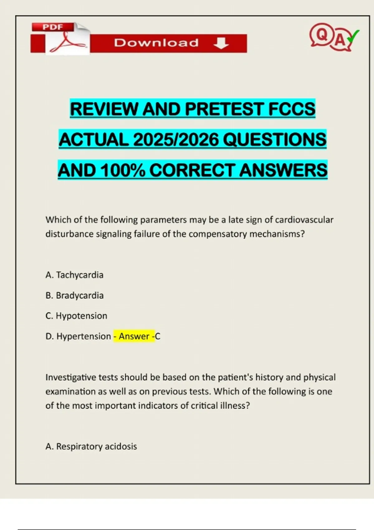 REVIEW AND PRETEST FCCS ACTUAL 2025/2026 QUESTIONS AND 100% CORRECT ANSWERS Which of the following parameters may be a late sign of cardiovascular disturbance signaling failure of the compensatory mechanisms? A. Tachycardia B. Bradycardia C. Hypotension D. Hypertension - Answer -C Investigative tests should be based on the patient's history and physical examination as well as on previous tests. Which of the following is one of the most important indicators of critical illness? A. Respiratory acidosisNeed assistance on Online classes, Exams & Assignments? Reach out for instant help!! Full Course Assistance, Plagiarism-free Essay Writing, Research Paper, Dissertation, Discussion Posts, etc…. Confidential & Secure services. Tutors are available for all subjects! Email now at: B. Metabolic acidosis C. Elevated creatinine D. Hyponatremia - Answer -B A 22-year-old man is brought to the emergency room after falling from a horse. He is awaiting transfer to another facility. He has a chest contusion and a non-displaced femur fracture. He is in spinal motion restriction with a cervical collar and long backboard. He has worsening respiratory distress and hypoxemia requiring endotracheal intubation. Which of the following modification