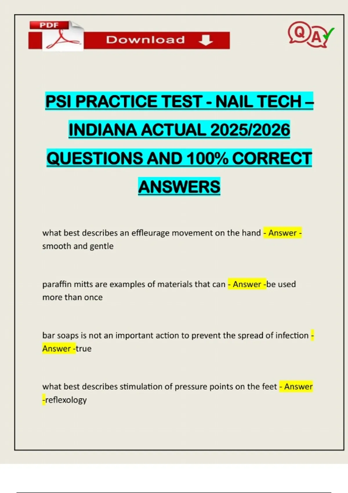 PSI PRACTICE TEST - NAIL TECH – INDIANA ACTUAL 2025/2026 QUESTIONS AND 100% CORRECT ANSWERS what best describes an effleurage movement on the hand - Answer - smooth and gentle paraffin mitts are examples of materials that can - Answer -be used more than once bar soaps is not an important action to prevent the spread of infection - Answer -true what best describes stimulation of pressure points on the feet - Answer -reflexologyNeed assistance on Online classes, Exams & Assignments? Reach out for instant help!! Full Course Assistance, Plagiarism-free Essay Writing, Research Paper, Dissertation, Discussion Posts, etc…. Confidential & Secure services. Tutors are available for all subjects! Email now at: does the cuticle benefit from uses of softeners on the FINGERNAIL? - Answer -NO what precaution must be taken when applying exfoliating foot scrubs? - Answer -put on gloves what is the definition of a synergistic product