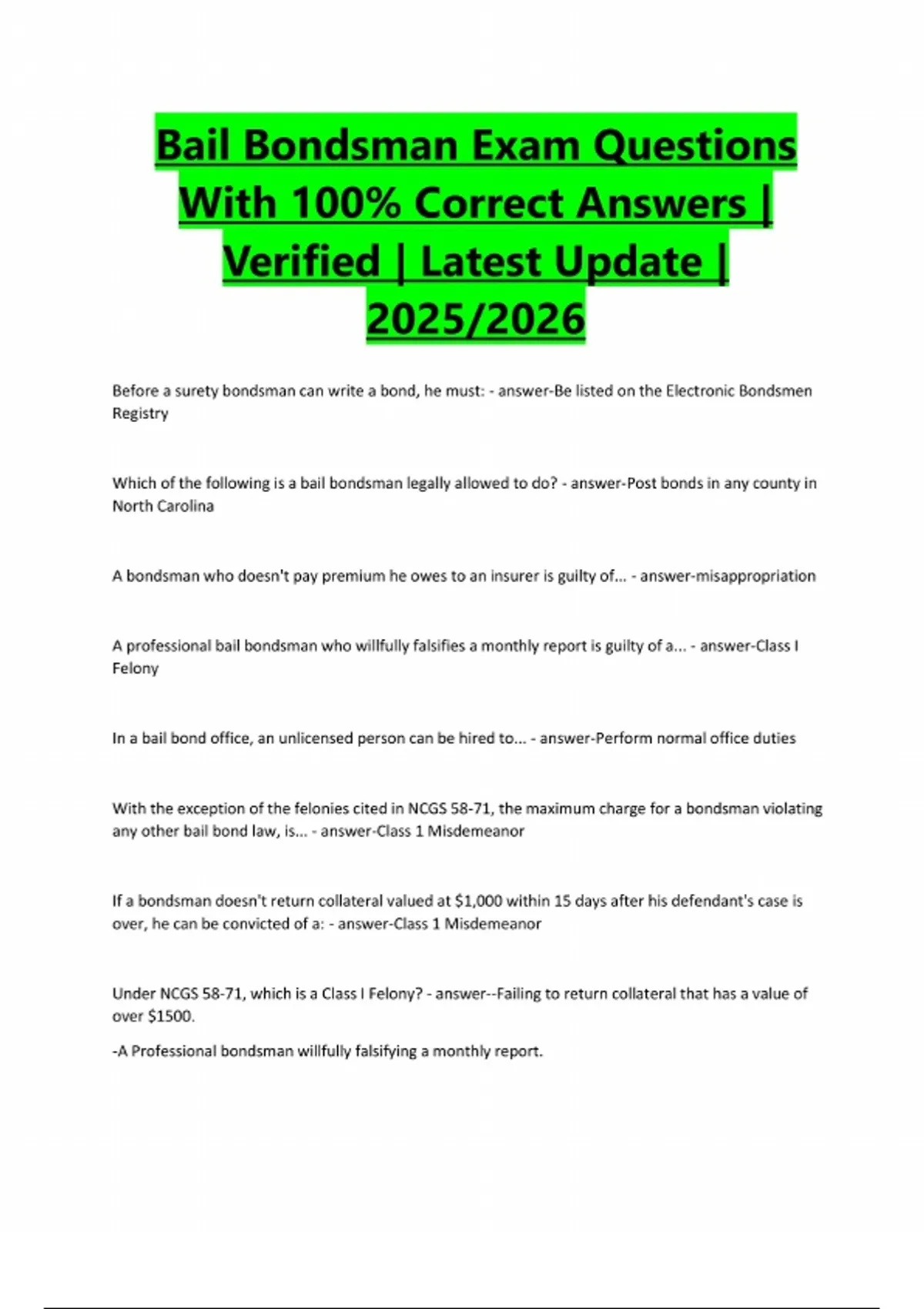 Bail Bondsman Exam Questions With 100% Correct Answers | Verified | Latest Update | 2025/2026 Before a surety bondsman can write a bond, he must: - answer-Be listed on the Electronic Bondsmen Registry Which of the following is a bail bondsman legally allowed to do? - answer-Post bonds in any county in North Carolina A bondsman who doesn't pay premium he owes to an insurer is guilty of... - answer-misappropriation A professional bail bondsman who willfully falsifies a monthly report is guilty of a... - answer-Class I Felony In a bail bond office, an unlicensed person can be hired to... - answer-Perform normal office duties With the exception of the felonies cited in NCGS 58-71, the maximum charge for a bondsman violating any other bail bond law, is... - answer-Class 1 Misdemeanor If a bondsman doesn't return collateral valued at $1,000 within 15 days after his defendant's case is over, he can be convicted of a: - answer-Class 1 Misdemeanor Under NCGS 58-71, which is a Class I Felony? - answer--Failing to return collateral that has a value of over $1500. -A Professional bondsman willfully falsifying a monthly report