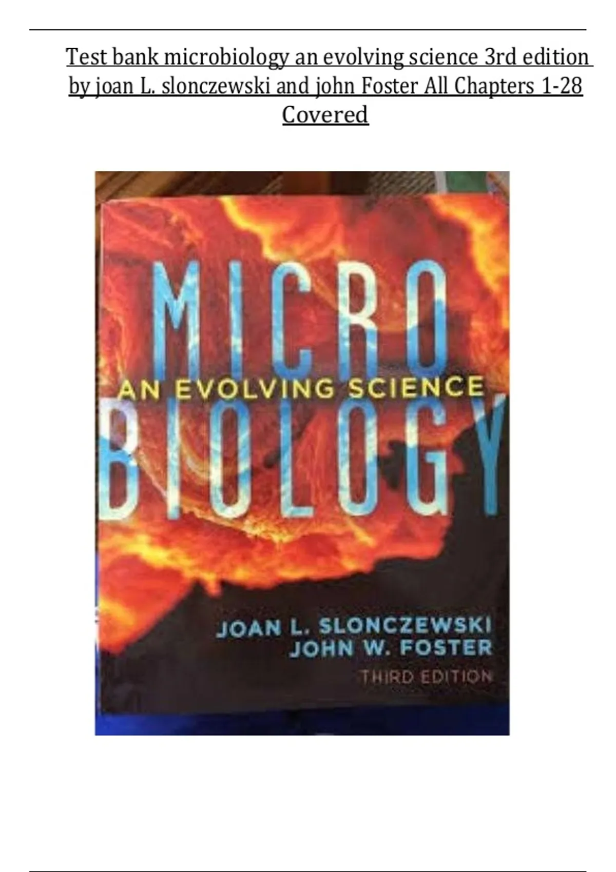 This document provides the complete test bank for Microbiology: An Evolving Science, 3rd Edition by Joan L. Slonczewski and John Foster. It covers all 28 chapters with multiple-choice questions, application-based problems, and detailed answers. Topics include microbial cell biology, genetics, evolution, immunology, pathogenic microorganisms, biotechnology, and clinical microbiology. Fully aligned with the textbook, this resource is ideal for exam preparation and comprehensive study.