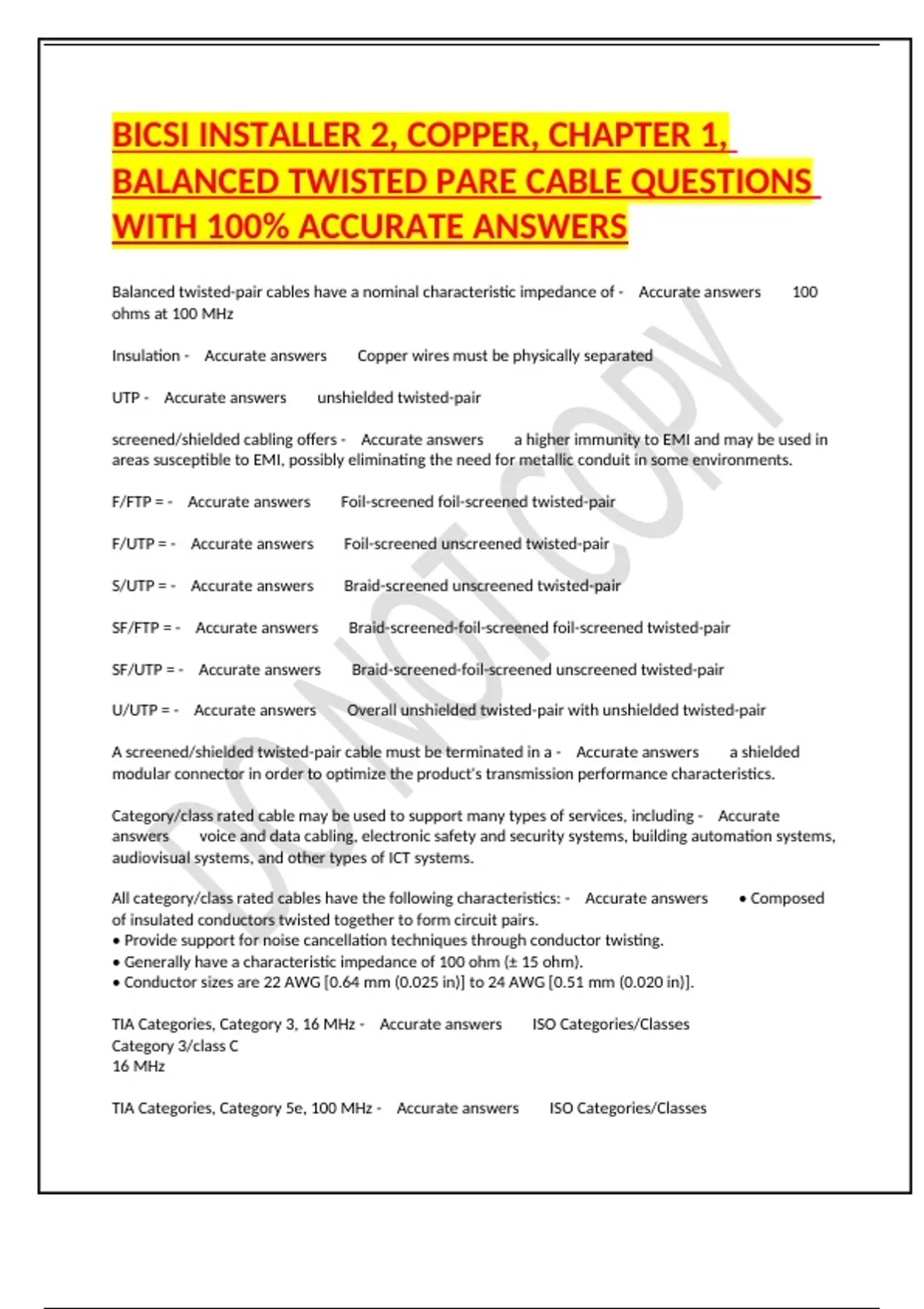 BICSI INSTALLER 2, COPPER, CHAPTER 1, BALANCED TWISTED PARE CABLE QUESTIONS WITH 100% ACCURATE ANSWERS