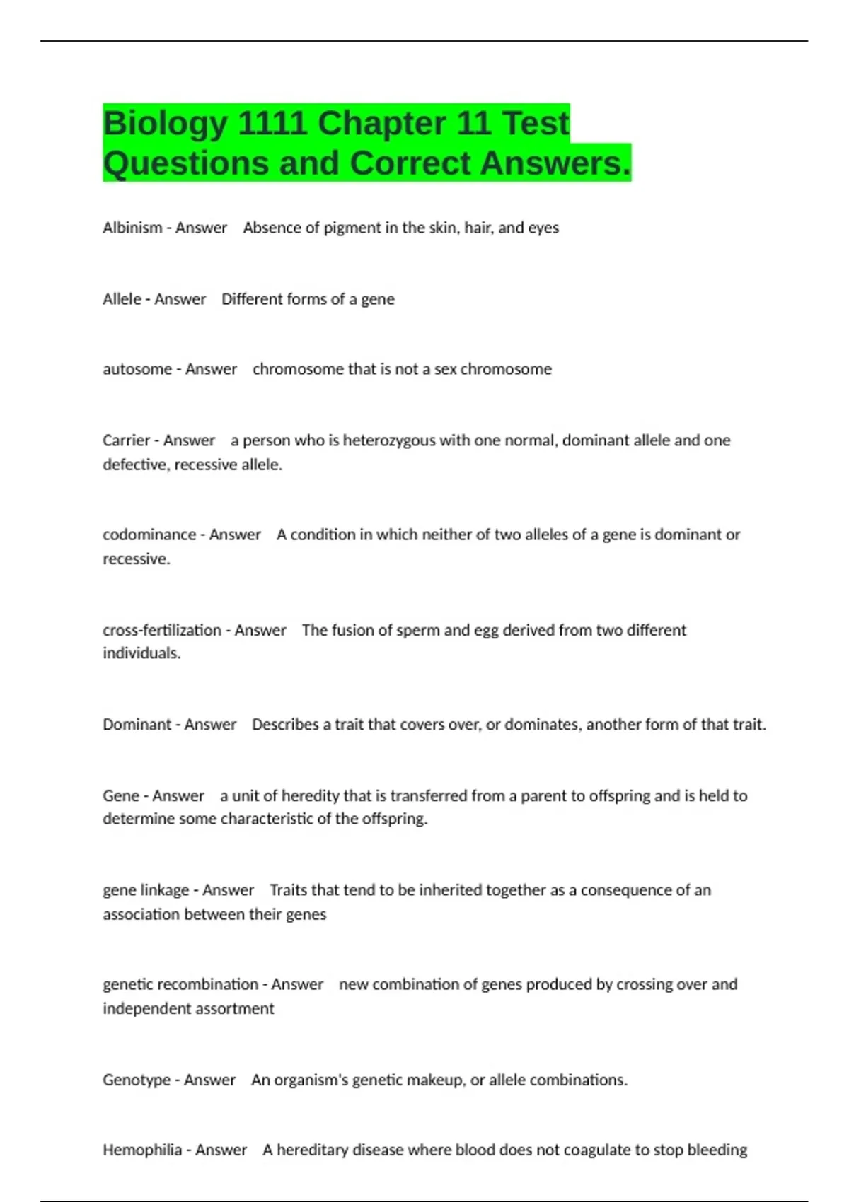 Biology 1111 Chapter 11 Test Questions and Correct Answers.
