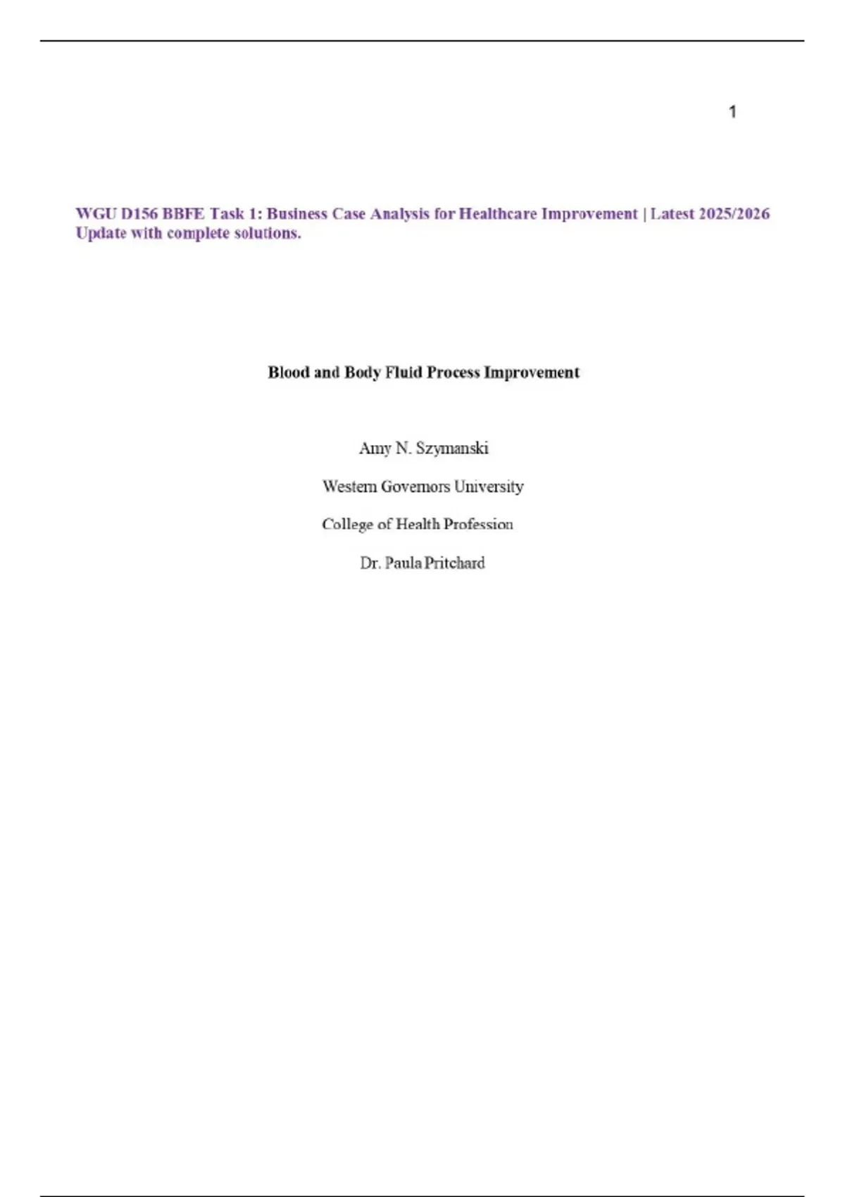 WGU D156 BBFE Task 1: Business Case Analysis for Healthcare Improvement | Latest 2025/2026 Update with complete solutions.