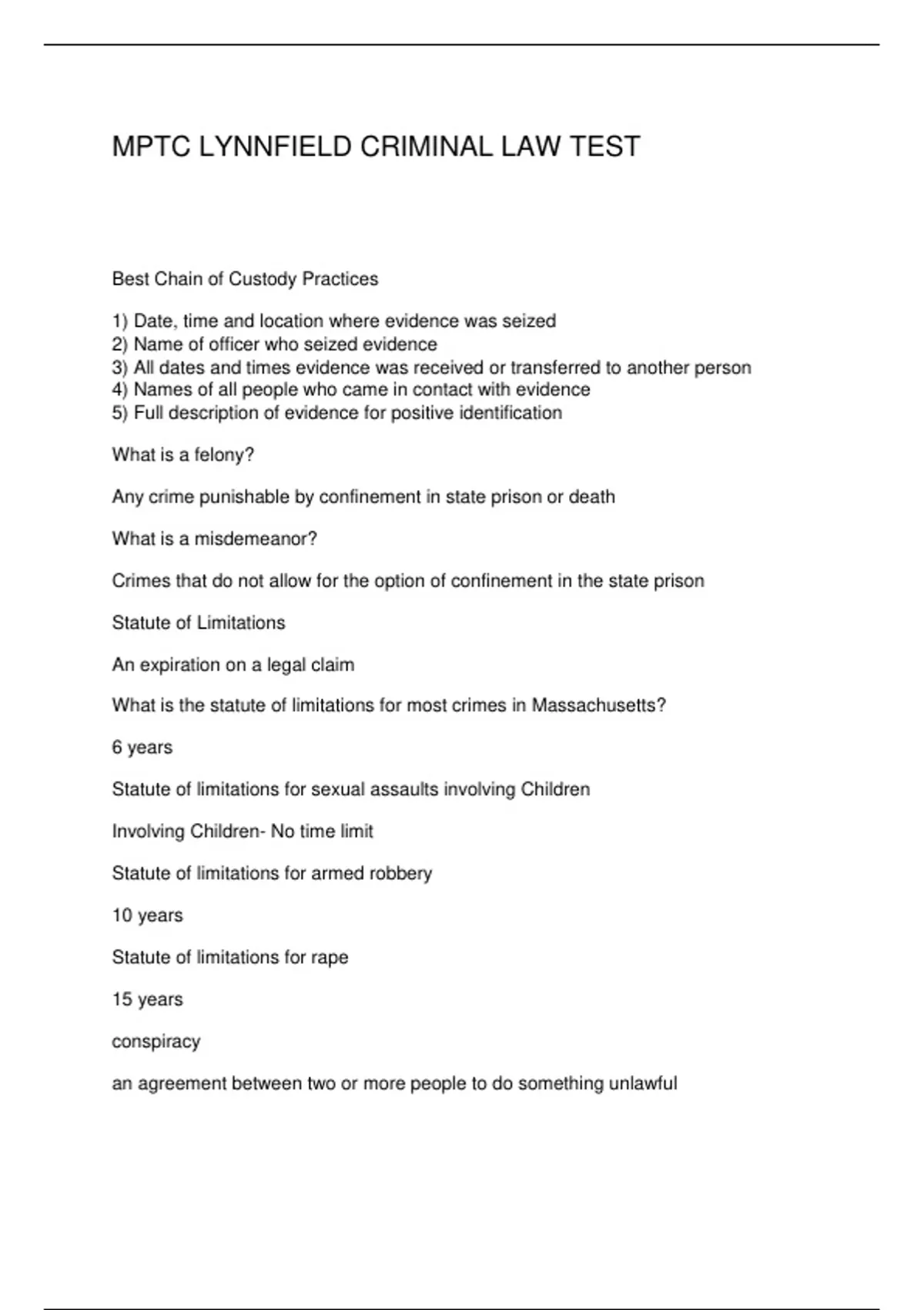 MPTC LYNNFIELD CRIMINAL LAW TEST