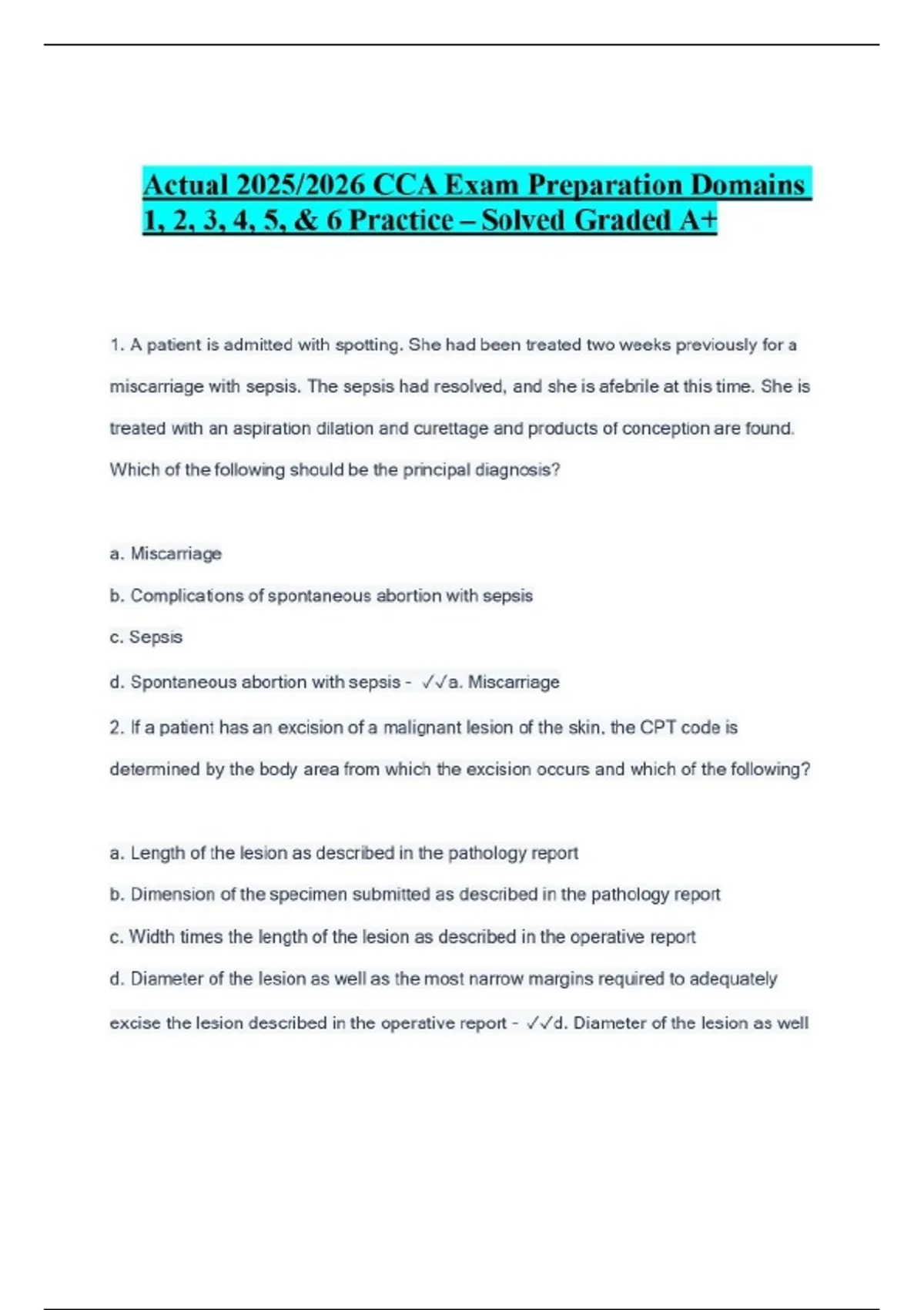 Actual 2025/2026 CCA Exam Preparation Domains 1, 2, 3, 4, 5, & 6 Practice – Solved Graded A+ 1. A patient is admitted with spotting. She had been treated two weeks previously for a miscarriage with sepsis. The sepsis had resolved, and she is afebrile at this time. She is treated with an aspiration dilation and curettage and products of conception are found. Which of the following should be the principal diagnosis? a. Miscarriage b. Complications of spontaneous abortion with sepsis c. Sepsis d. Spontaneous abortion with sepsis - a. Miscarriage 2. If a patient has an excision of a malignant lesion of the skin, the CPT code is determined by the body area from which the excision occurs and which of the following?