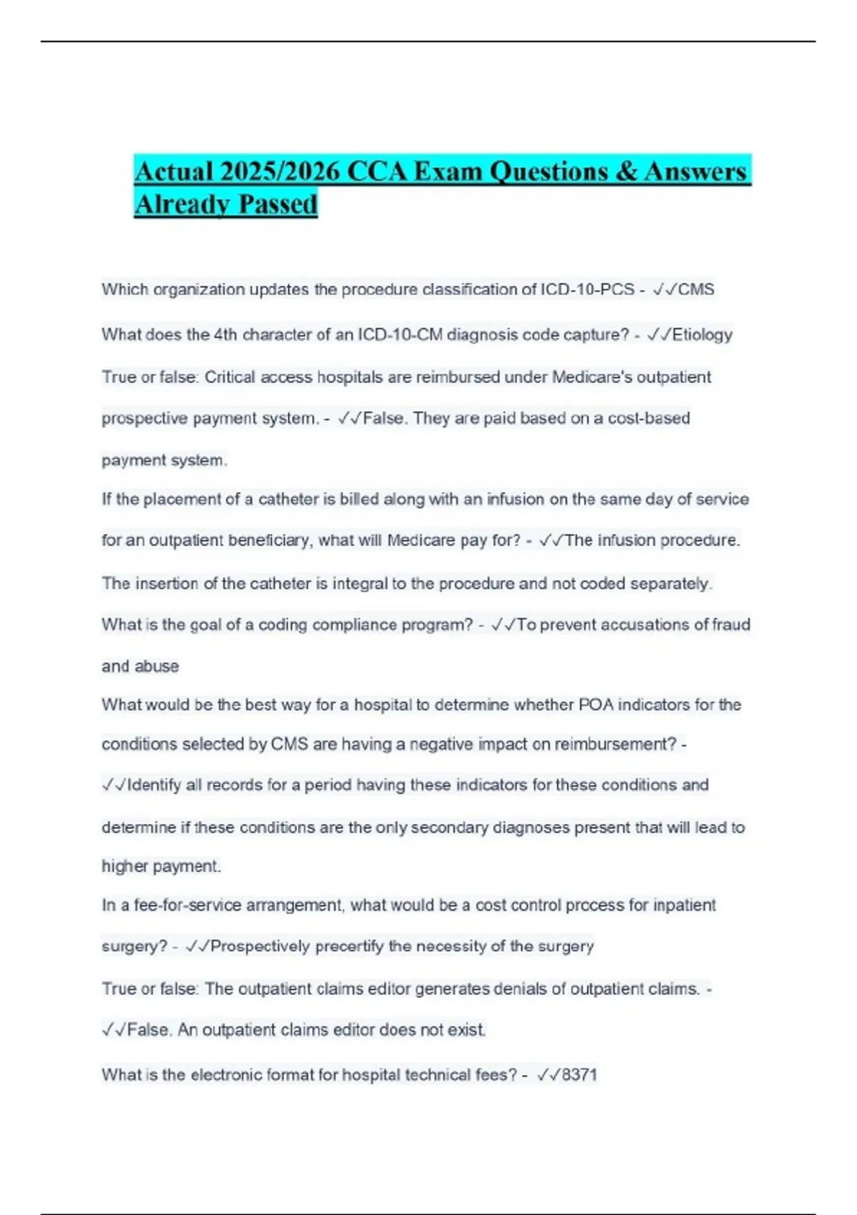 Actual 2025/2026 CCA Exam Questions & Answers Already Passed Which organization updates the procedure classification of ICD-10-PCS - CMS What does the 4th character of an ICD-10-CM diagnosis code capture? - Etiology True or false: Critical access hospitals are reimbursed under Medicare's outpatient prospective payment system. - False. They are paid based on a cost-based payment system. If the placement of a catheter is billed along with an infusion on the same day of service for an outpatient beneficiary, what will Medicare pay for? - The infusion procedure. The insertion of the catheter is integral to the procedure and not coded separately. What is the goal of a coding compliance program? - To prevent accusations of fraud and abuse What would be the best way for a hospital to determine whether POA indicators for the conditions selected by CMS are having a negative impact on reimbursement? - Identify all records for a period having these indicators for these conditions and determine if these conditions are the only secondary diagnoses present that will lead to higher payment.