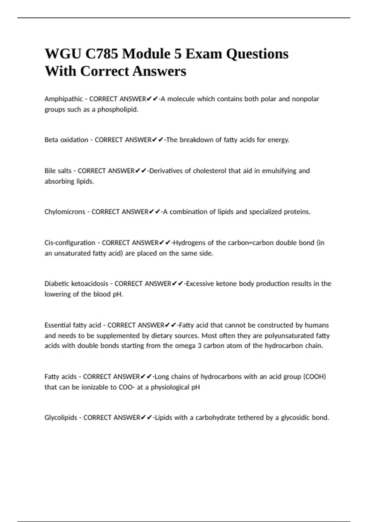 Fatty |acids |- |CORRECT |ANSWER✔✔-Long |chains |of |hydrocarbons |with |an |acid |group |(COOH) |