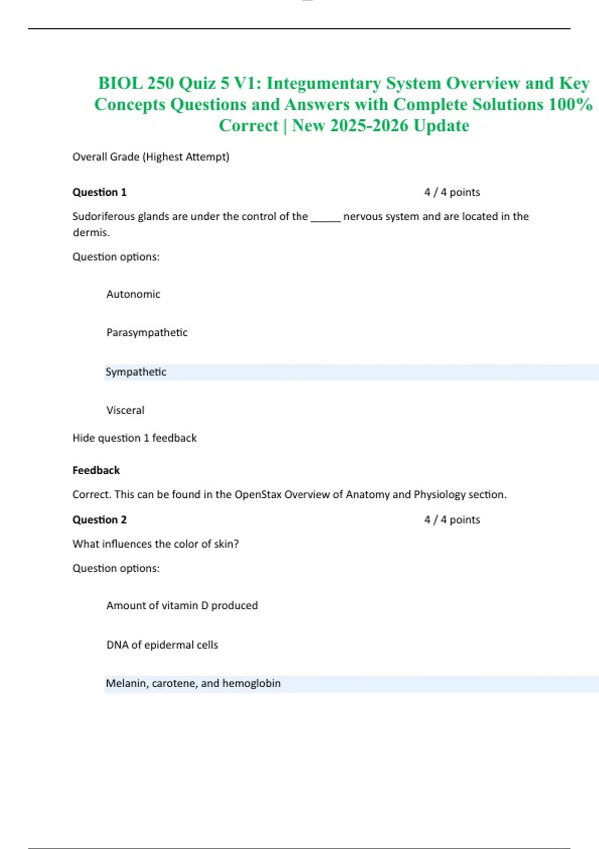 BIOL 250 Quiz 5 V1: Integumentary System Overview and Key