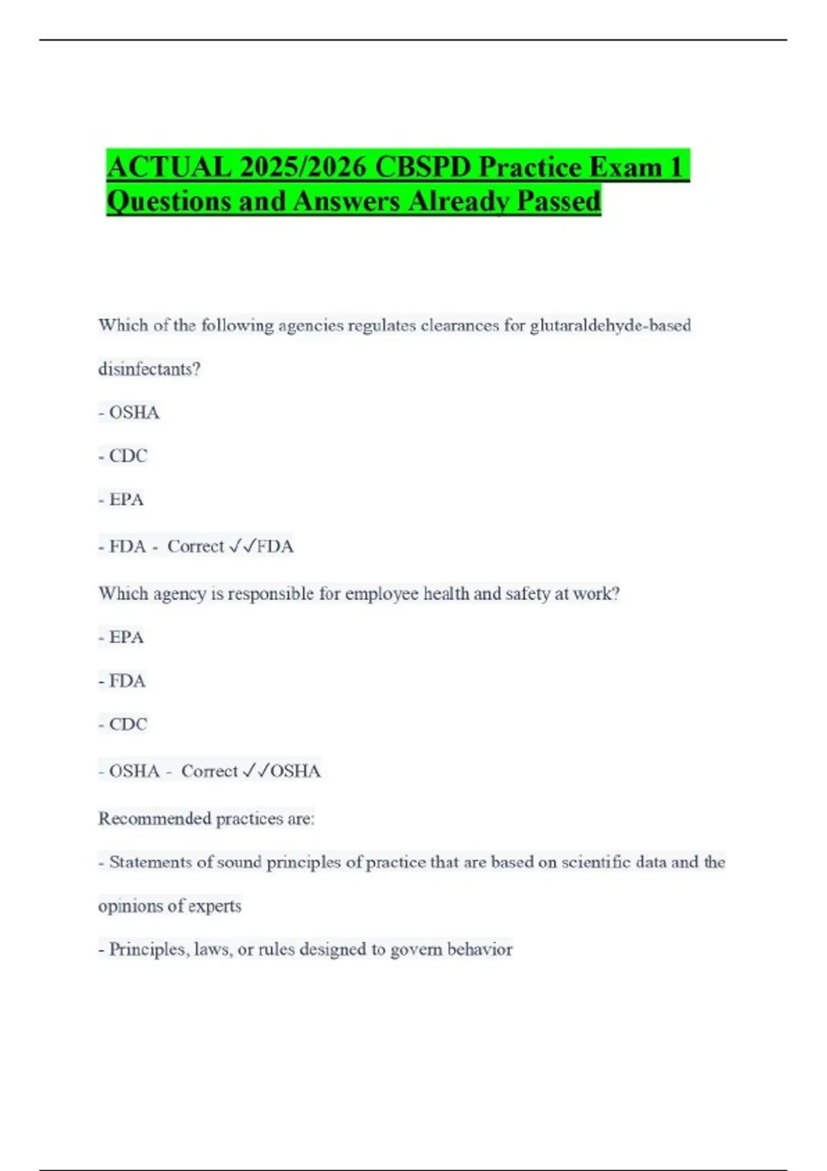 ACTUAL 2025/2026 CBSPD Practice Exam 1 Questions and Answers Already Passed Which of the following agencies regulates clearances for glutaraldehyde-based disinfectants? - OSHA - CDC - EPA - FDA - Correct FDA Which agency is responsible for employee health and safety at work? - EPA - FDA - CDC - OSHA - Correct OSHA Recommended practices are: - Statements of sound principles of practice that are based on scientific data and the opinions of experts - Principles, laws, or rules designed to govern behavior