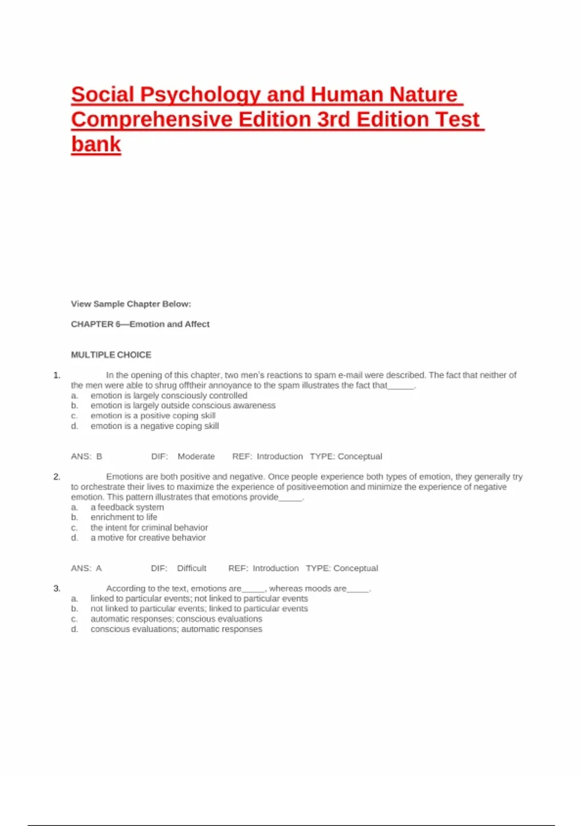 Social Psycholoqy and Human Nature Comprehensive Edition 3rd Edition Test bank