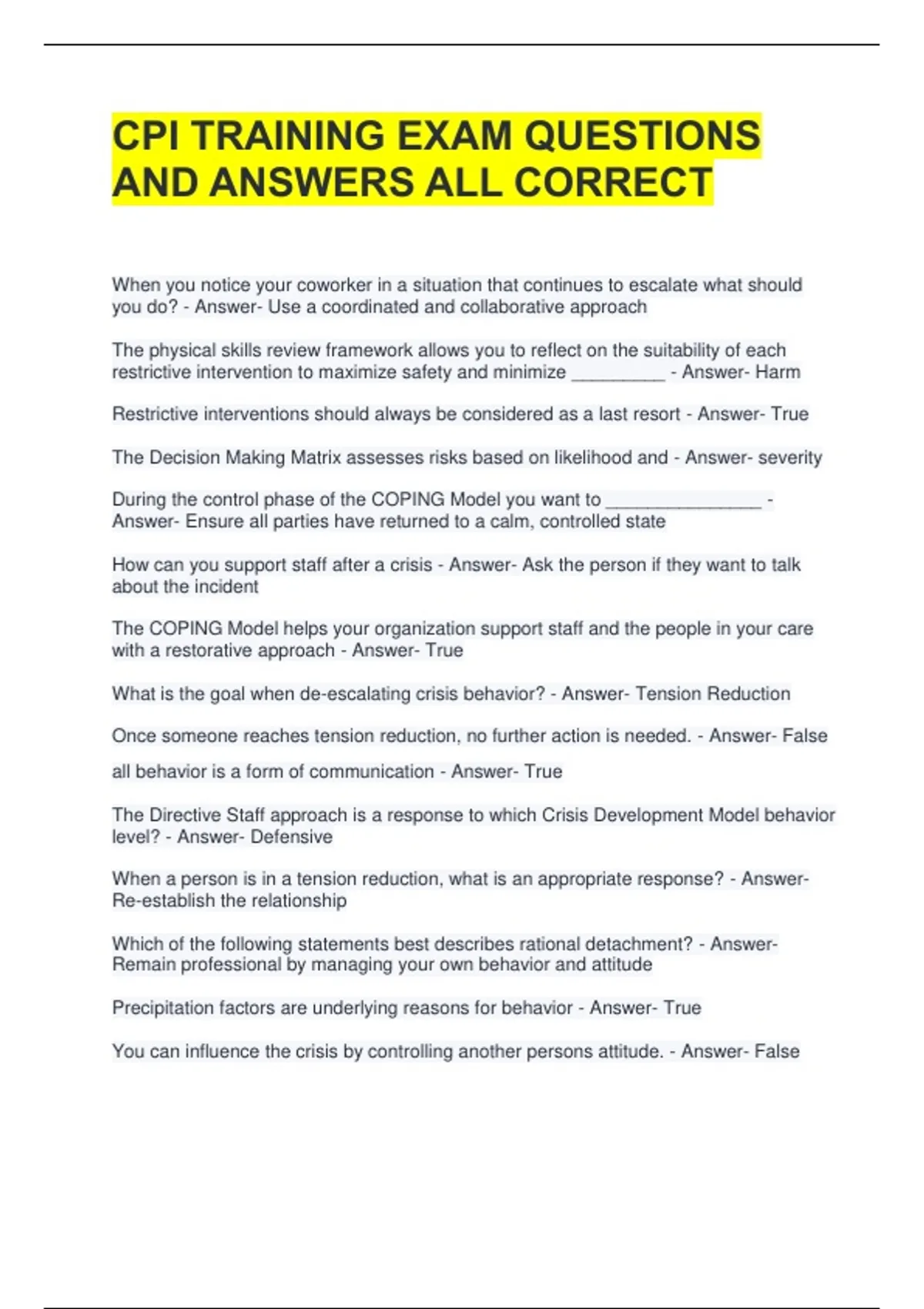 CPI TRAINING EXAM QUESTIONS AND ANSWERS ALL CORRECT