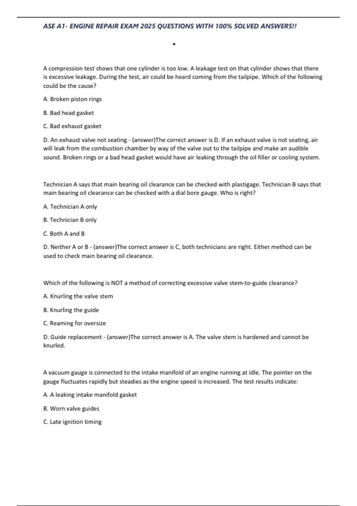 ,ASE A1- ENGINE REPAIR EXAM 2025 QUESTIONS WITH 100% SOLVED ANSWERS!!