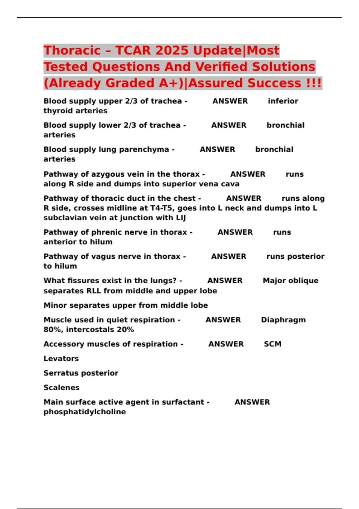 Thoracic – TCAR 2025 Update|Most Tested Questions And Verified Solutions (Already Graded A+)|Assured Success !!!