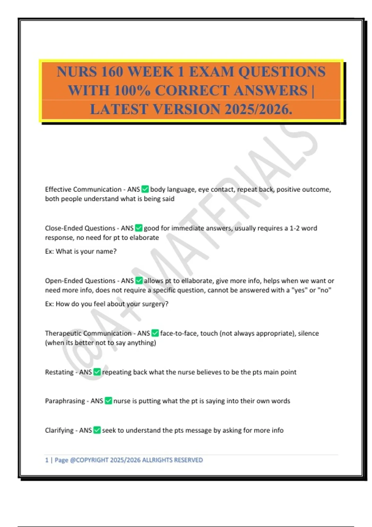NURS 160 WEEK 1 EXAM QUESTIONS WITH 100% CORRECT ANSWERS | LATEST VERSION 2025/2026.
