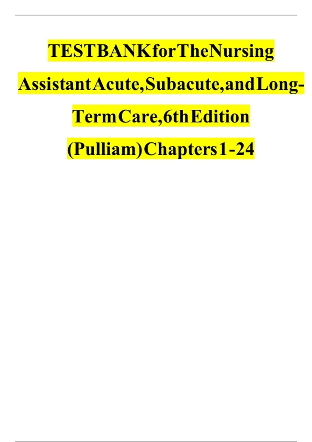 , Test Bank - The Nursing Assistant: Acute, Subacute, and Long-Term Care, 6e (Pulliam, 2020)