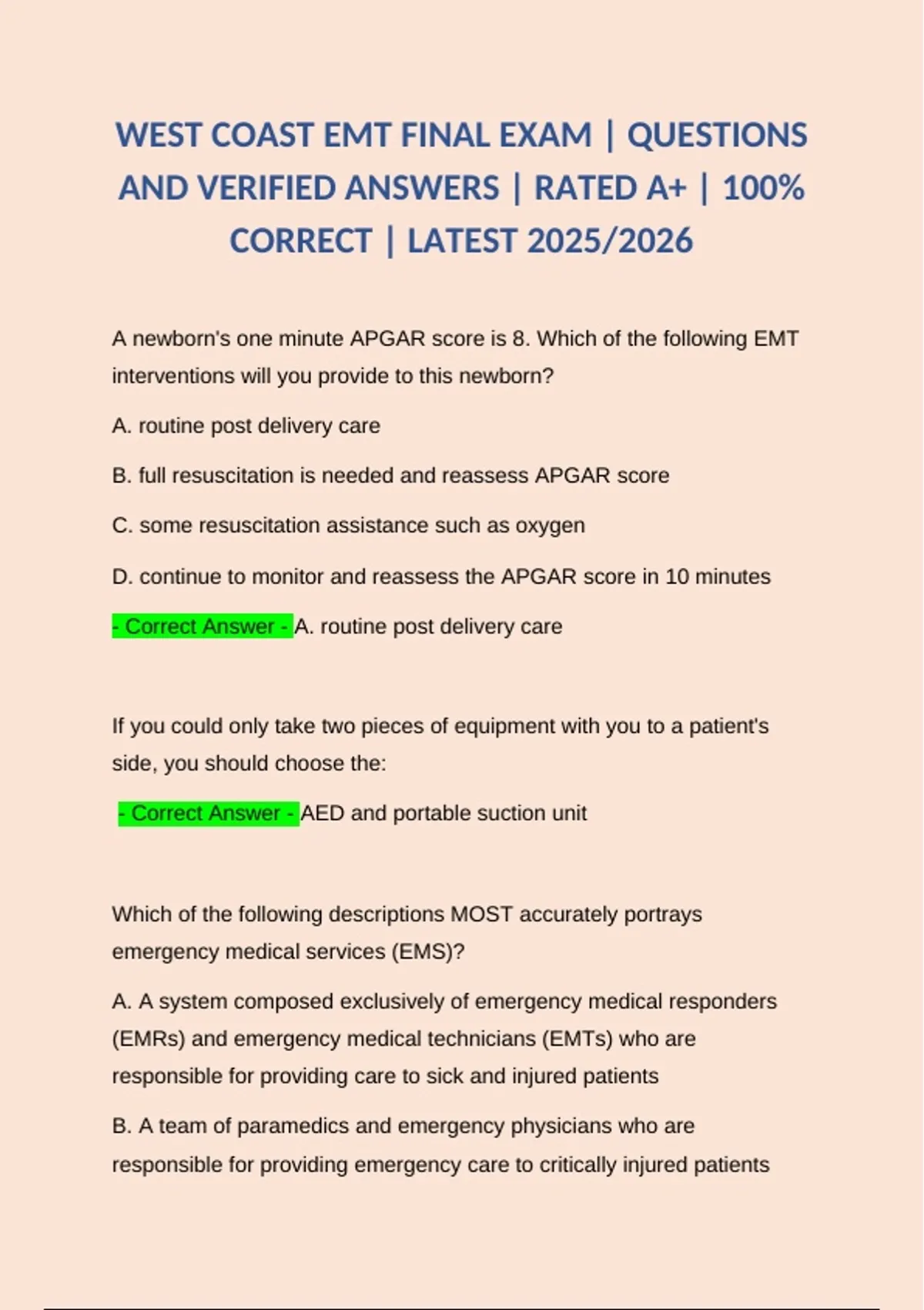 WEST COAST EMT FINAL EXAM | QUESTIONS AND VERIFIED ANSWERS | RATED A+ | 100% CORRECT | LATEST 2025/2026 WEST COAST EMT FINAL EXAM | QUESTIONS AND VERIFIED ANSWERS | RATED A+ | 100% CORRECT | LATEST 2025/2026