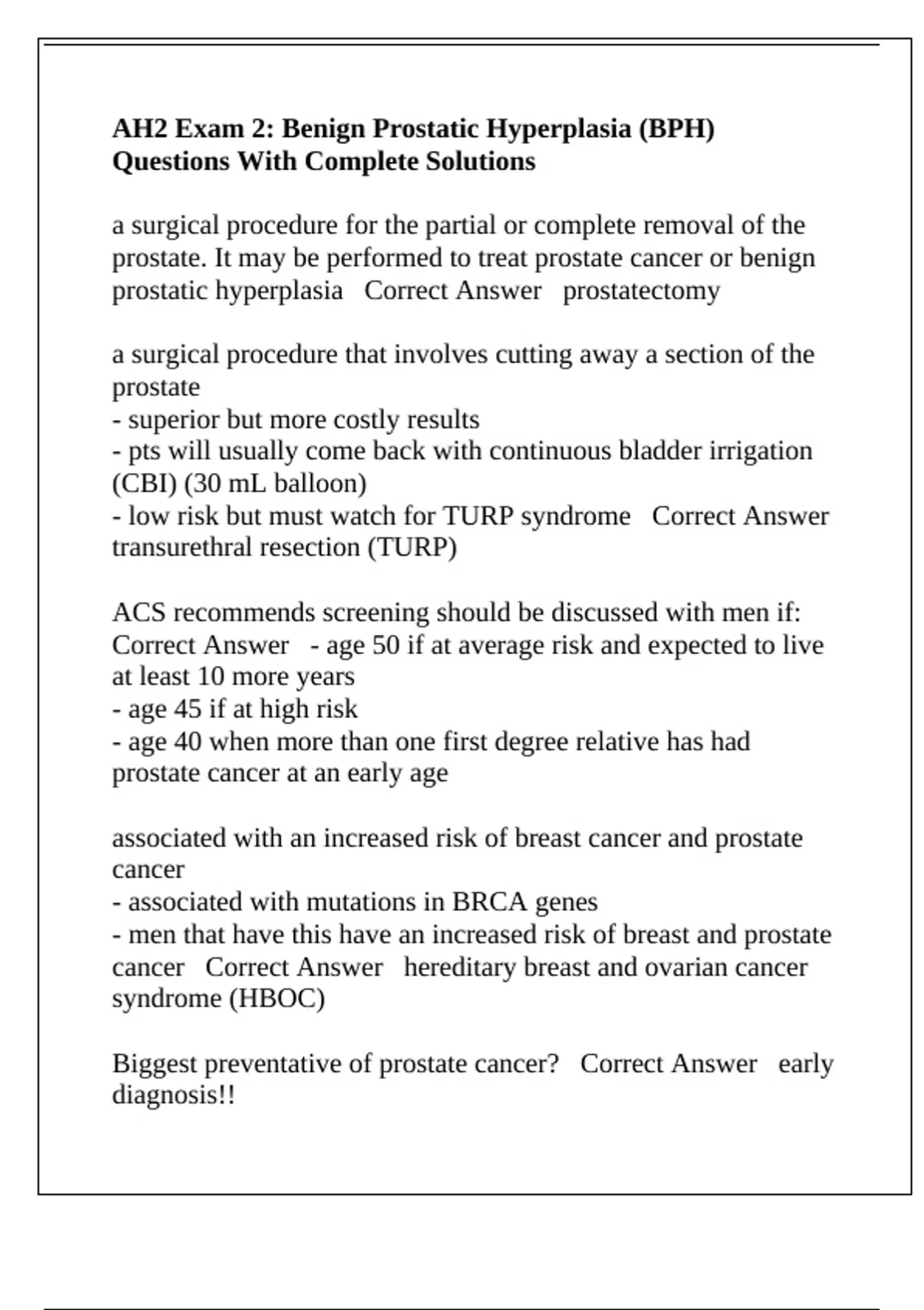 prostatic hyperplasia Correct Answer prostatectomy