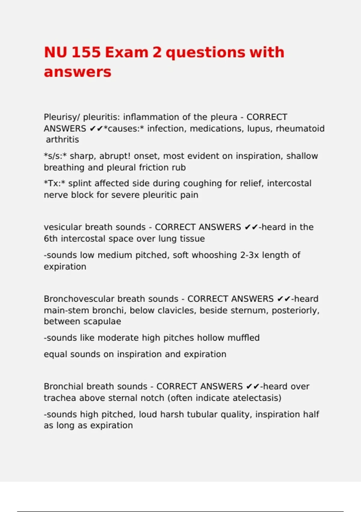 Bronchial breath sounds - CORRECT ANSWERS ✔✔-heard over