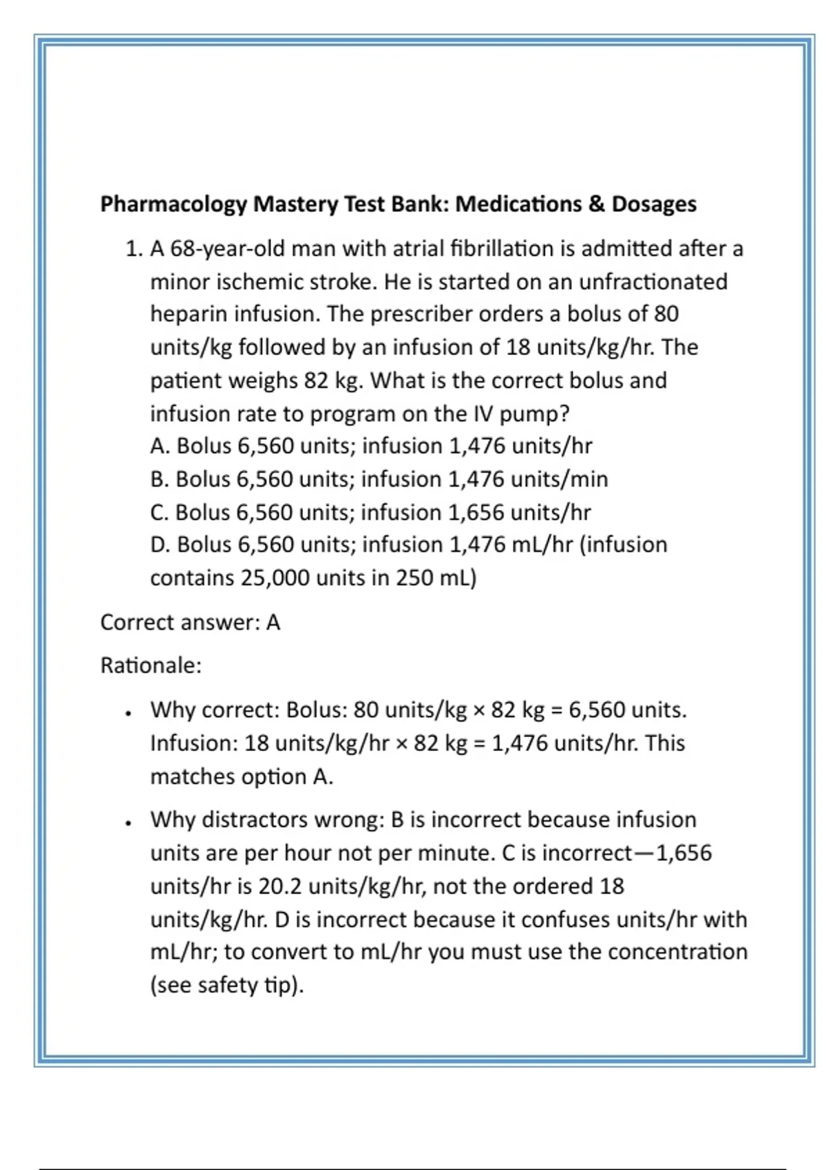 • Why correct: Bolus: 80 units/kg × 82 kg = 6,560 units.